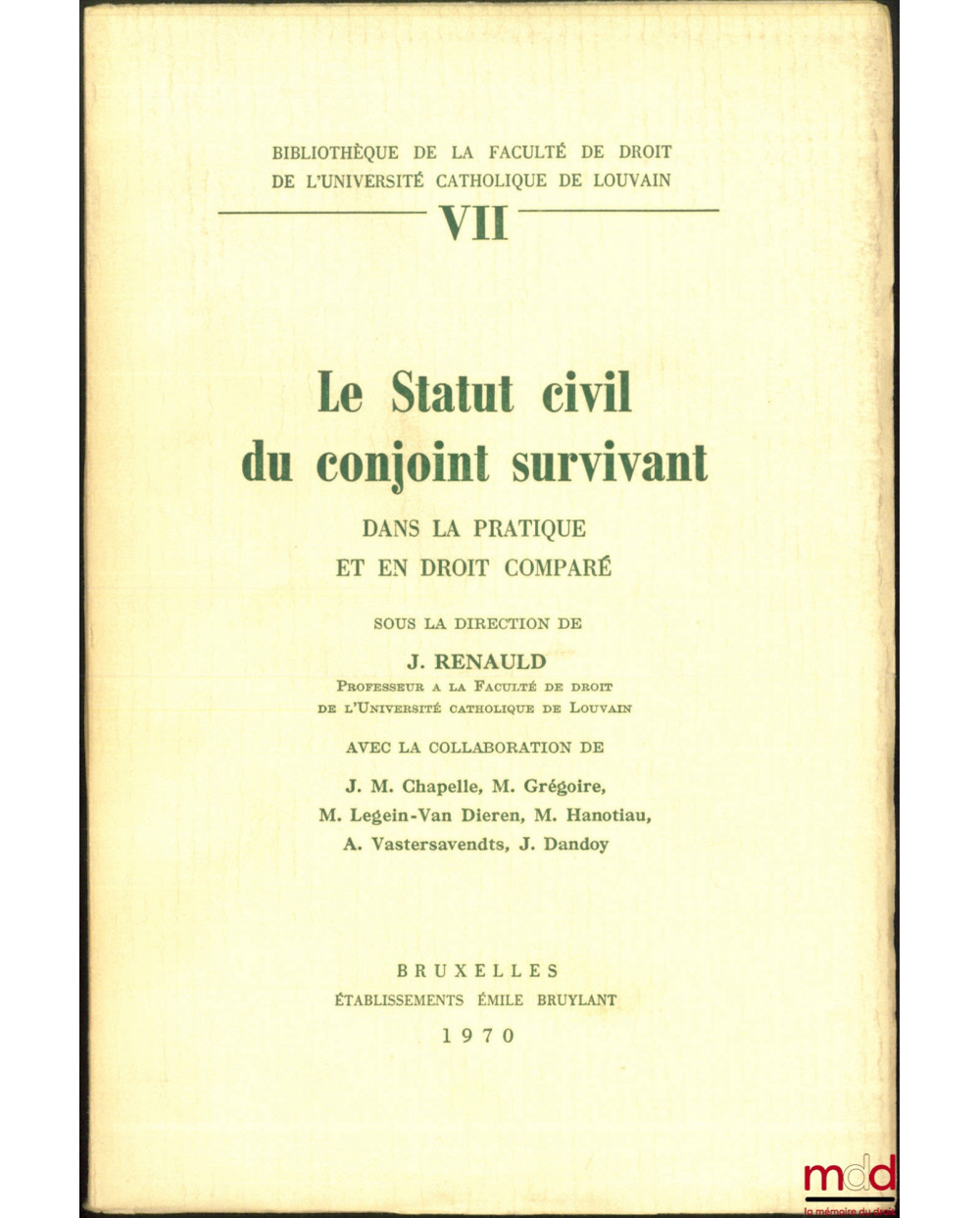 LE STATUT CIVIL DU CONJOINT SURVIVANT dans la pratique en en droit comparé, sous la dir. de J. Renauld, Bibl. de la Faculté de Droit de l’Université Catholique de Louvain, t. VII