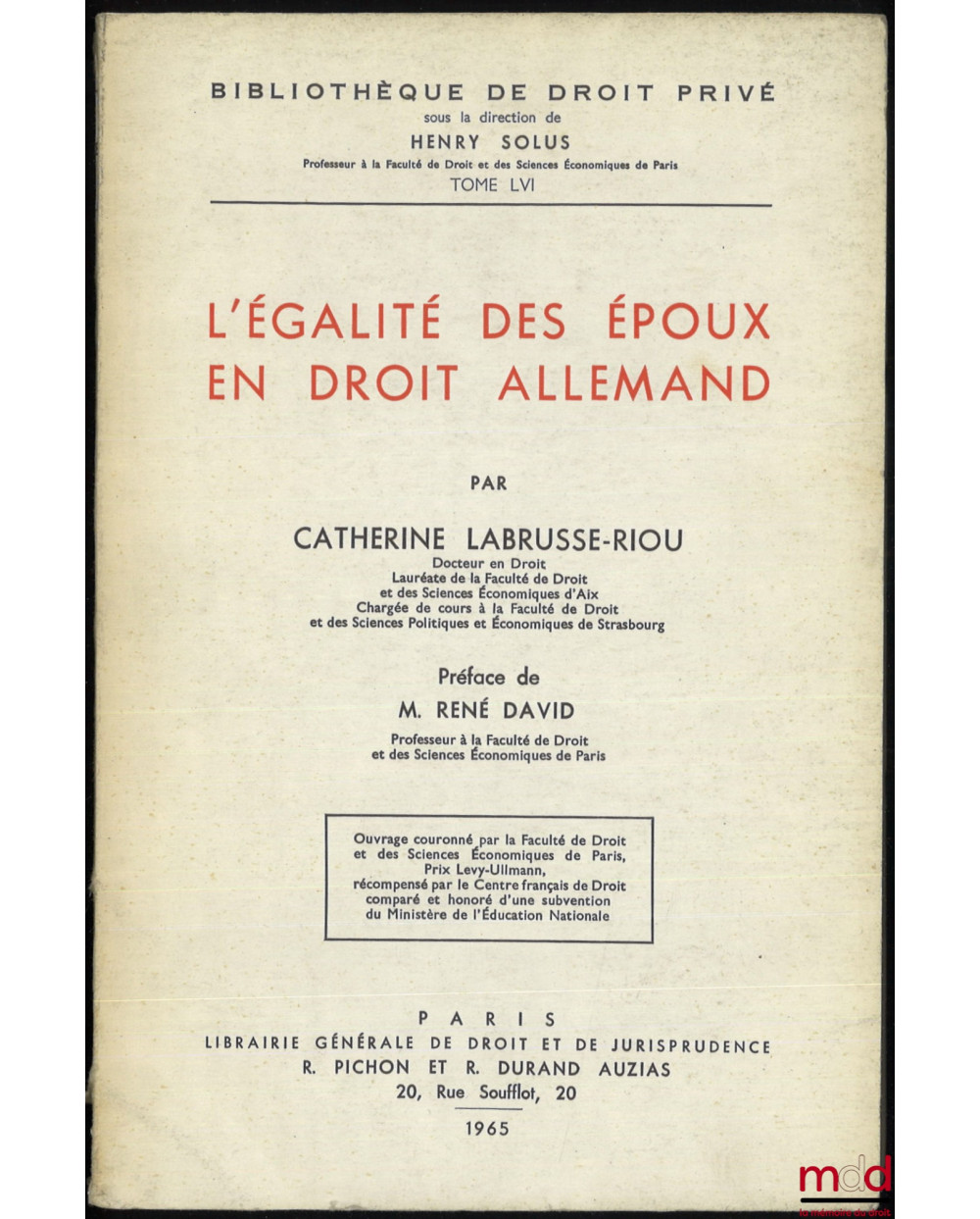 L’ÉGALITÉ DES ÉPOUX EN DROIT ALLEMAND, Préface de René David, Bibl. de droit privé, t. LVI