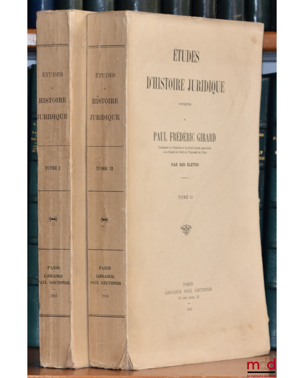 Exceptionnel recueil de Mélanges d’histoire aujourd’hui introuvable et qui rassemble, en particulier, les contributions de M.-J. Bry, L’Édit de Caracalla de 212 d’après le papyrus 40 de Gièssen ; André Fliniaux, Les effets de la simple absence dans la procédure de l’Ordo judiciorum à l’époque de Cicéron (pro Quinctio, XIX, 60, in Verrem, II, 2, 22-26) ; Georges Goyau, La tétrarchie ; Lucien Guenoun, La lex Sempronia judiciaria (632 U. C.) ; Henri Lévy-Bruhl, Examen d’un critérium grammatical de datation : le temps des verbes employés dans les citations des jurisconsultes romains ; Olivier Martin, Quelques observations sur l’operis novi nuntiatio ; Ernest Perrot, L’exercice de l’interdit quod legatorum par l’héritier civil ; Pierre Petot, Fructus duplio ; Hippolyte Pissard, Duci vel ferri jubere. La ductio jussu prætoris dans les actions réelles et les actions noxales ; Paul Ramadier, La représentation judiciaire des cités d’après l’Édit du Préteur ; Seymour de Ricci, Deux nouveaux papyrus juridiques ; Félix Senn, La question du transfert de la propriété sous un terme extinctif ou une condition résolutoire et la constitution de Dioclétien de l’an 286 (fragm. Vat., 283 - Cod. Just., 8, 54 (55) de donat, quæ sub. mod., 2) ; G. Testaud, Le Triboniani genius, sive de arte juris de François Gaultier ; J. Thélohan, De la stipulatio operarum ; Paul Thomas, Le rôle et le choix de l’exsecutor negotii dans la procédure extraordinaire, à l’époque de Justinien (Étude sur un papyrus byzantin du Musée du Caire, n° 67.032) ; Pierre de Tourtoulon, Le Velléien chez les Glossateurs ; Paul Viard, Un romaniste bourguignon du XVIe siècle : Jean Bégat (1523-1572). TOME II : Louis Boulard, La vente dans les actes coptes ; Auguste Dumas, Les origines romaines de l’article 1150 du Code Civil (Histoire de l’interprétation de la 1. un C. j. 7, 47, de sententiis quæe pro eo quod interest proferuntur) ; Maurice Krœll, Étude sur l’institution des lites en droit franc ; Ernest Lyon, Le droit chez Isidore de Péluse ; Pierre Maria, Observation sur la possession du défenseur à la rei vindicatio ; Eugène Vernay, Note sur le changement de style dans les constitutions impériales de Dioclétien à Constantin ; Jean Juster, La condition légale des Juifs sous les rois visigoths ; Elemér Balog, Skizzen aus der römischen Rechtsgeschichte.