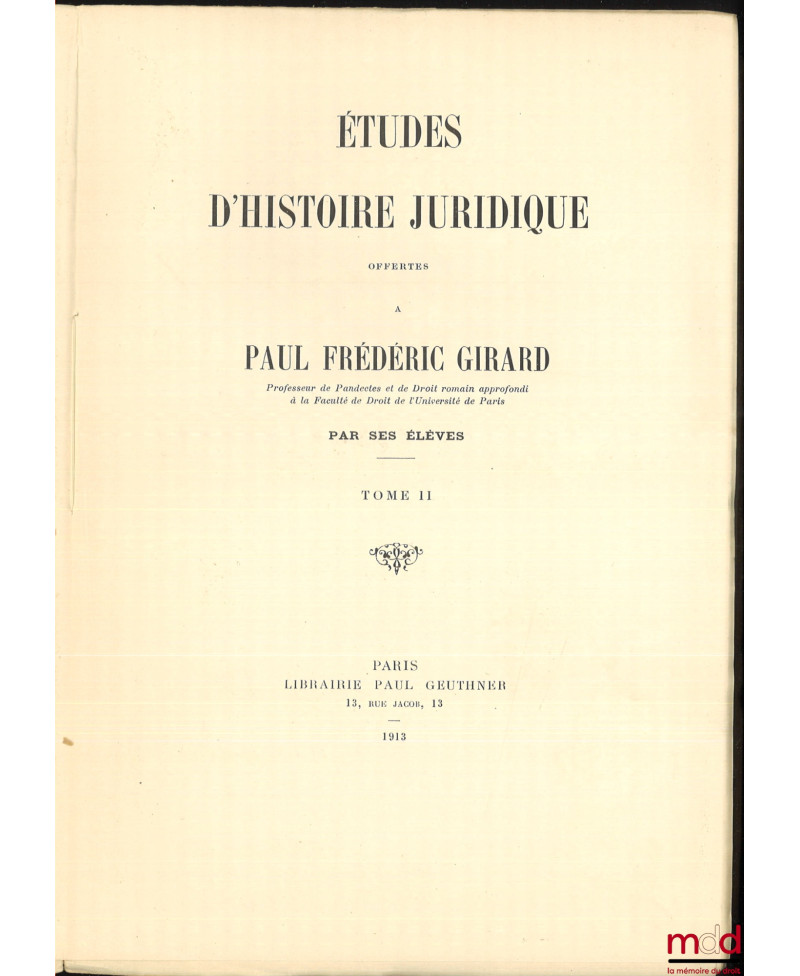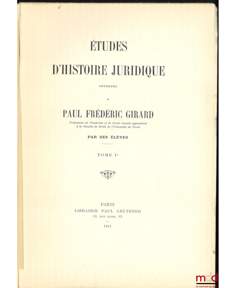 ÉTUDES D’HISTOIRE JURIDIQUE OFFERTES À PAUL FRÉDÉRIC GIRARD PAR SES ÉLÈVES