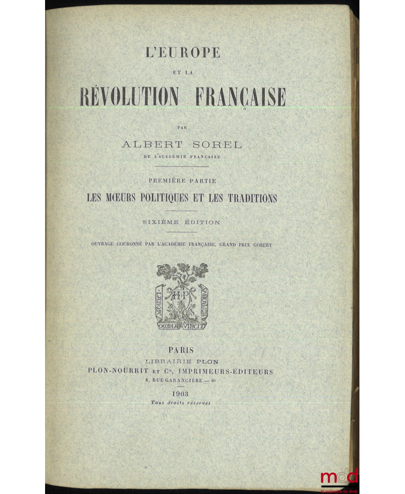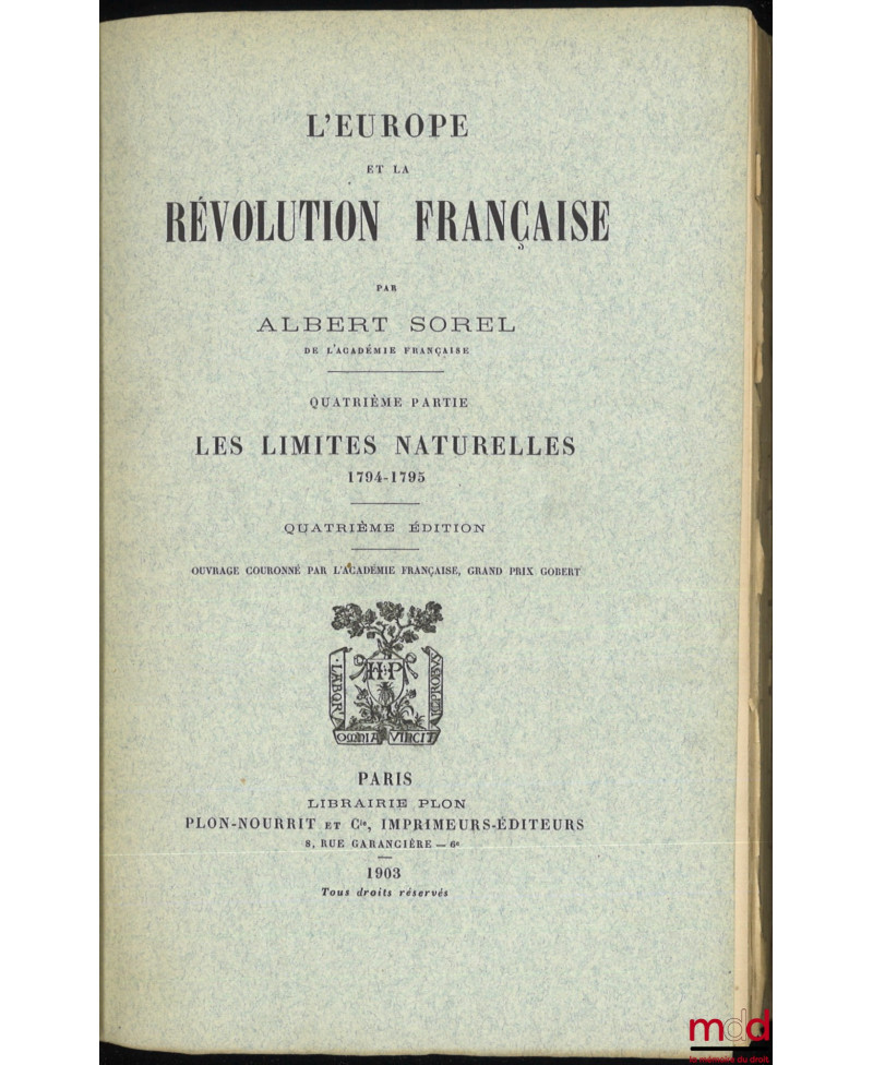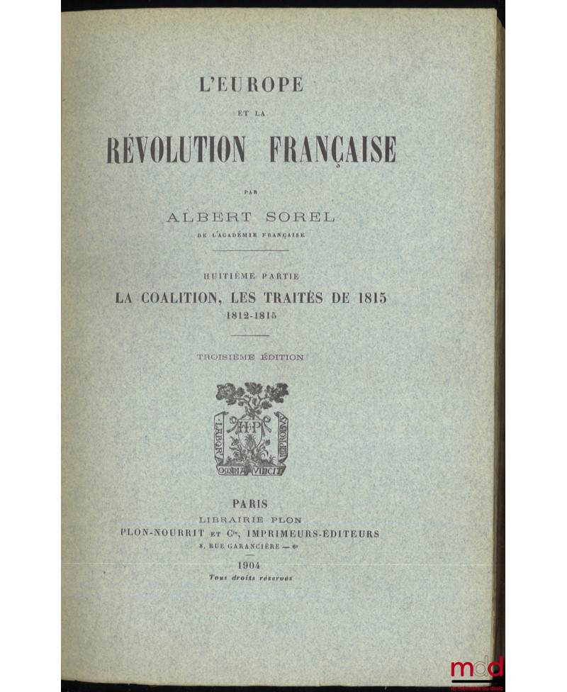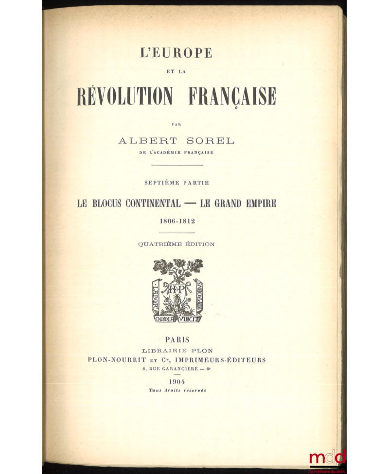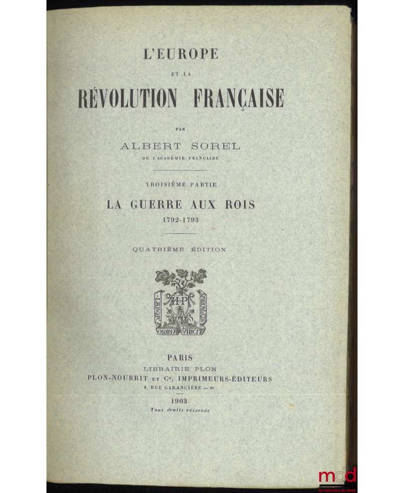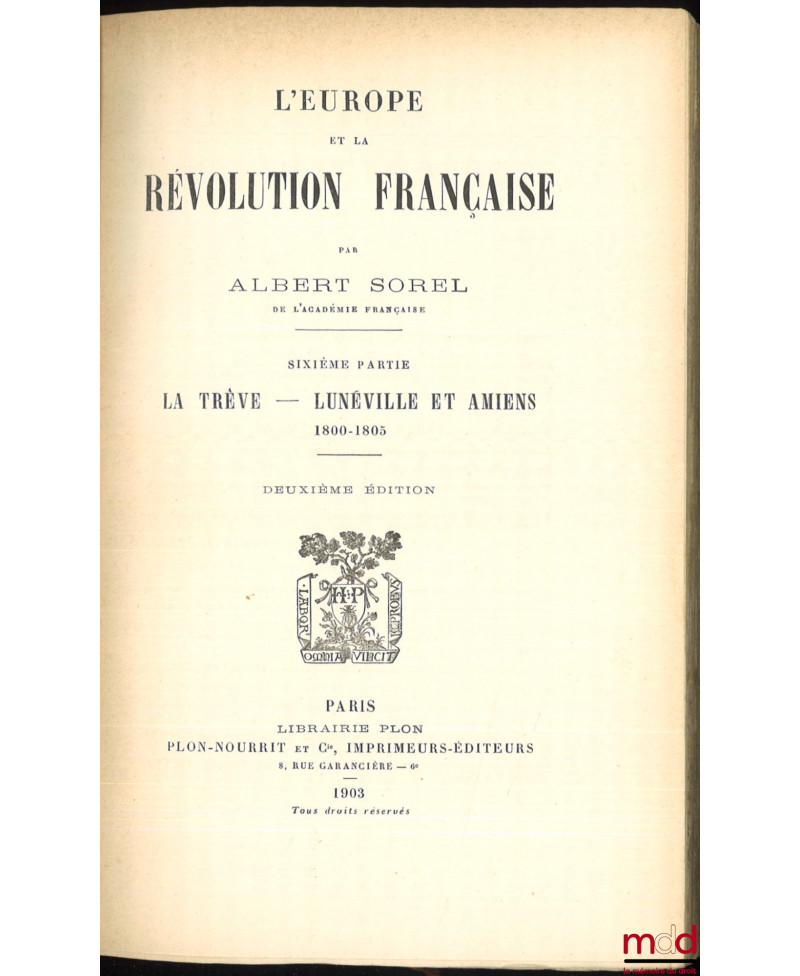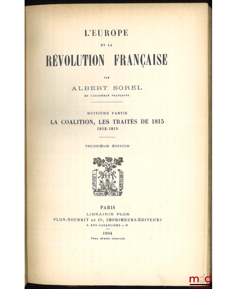 L’EUROPE ET LA RÉVOLUTION FRANÇAISE :t. I : Les moeurs politiques et les traditions (6e éd., 1903) ;t. II : La chute de la Royauté (5e éd., 1903) ;t. III : La guerre aux Rois, 1792-1793 (4e éd., 1903) ;t. IV : Les limites naturelles, 1794-1795 (4e éd., 1903) ;t. V : Bonaparte et le Directoire, 1795-1799 (2e éd., 1903) ;t. VI : La trêve – Lunéville et Amiens, 1800-1805 (2e éd., 1903) ;t. VII : Le blocus continental – le Grand Empire (4e éd., 1904) ;t. VIII : La coalition, les traités de 1815, 1812-1815 (3e éd., 1904)