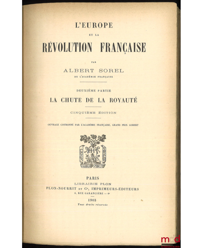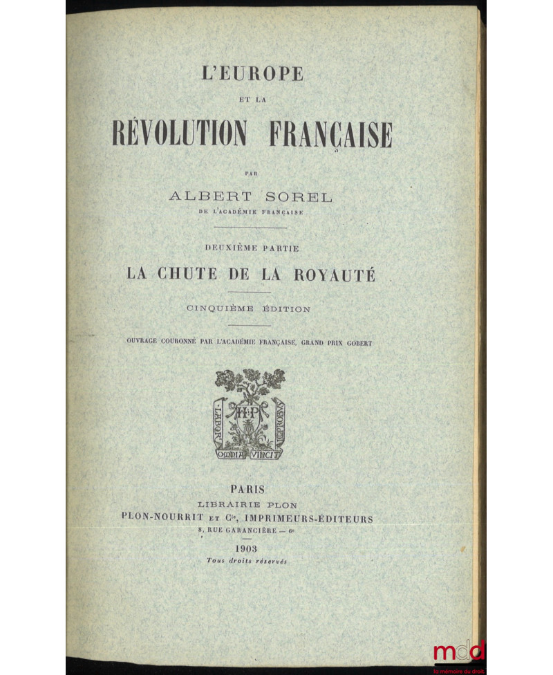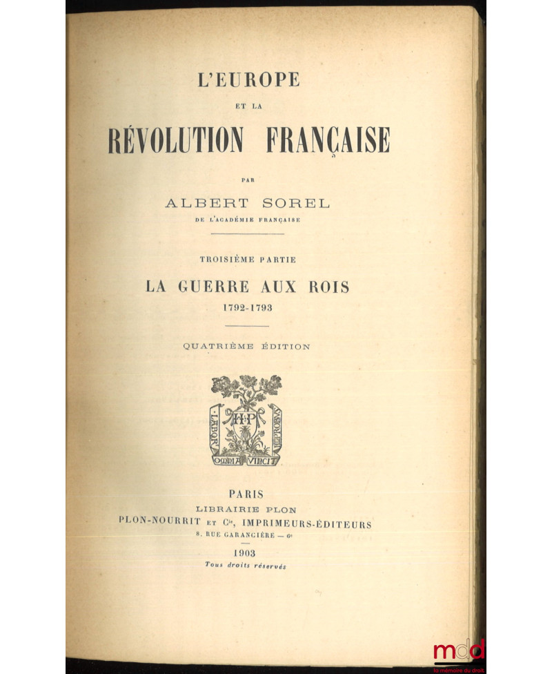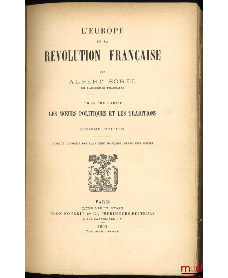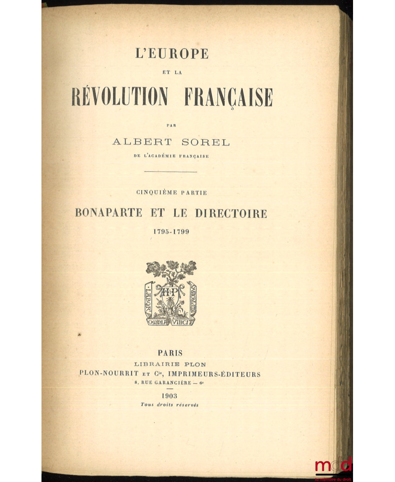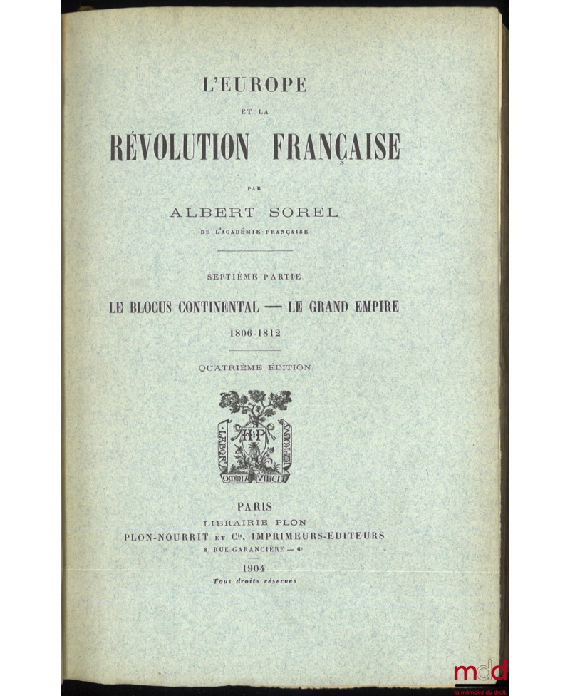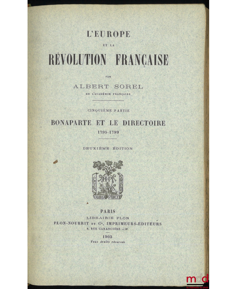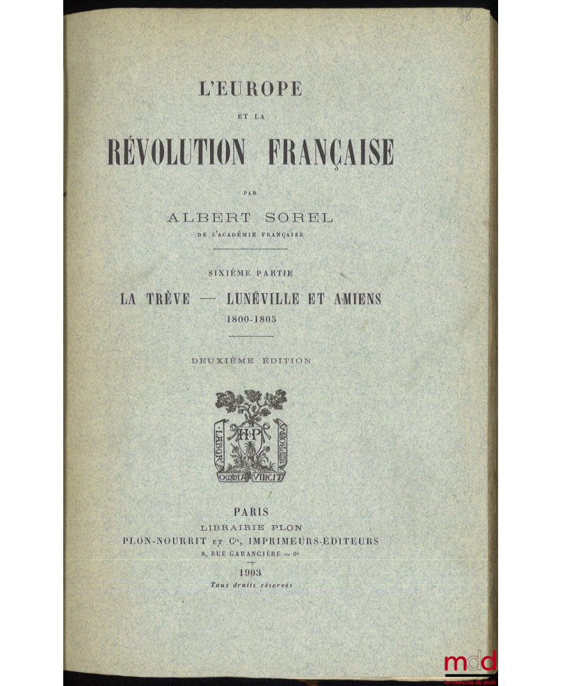 L’EUROPE ET LA RÉVOLUTION FRANÇAISE :t. I : Les moeurs politiques et les traditions (6e éd., 1903) ;t. II : La chute de la Royauté (5e éd., 1903) ;t. III : La guerre aux Rois, 1792-1793 (4e éd., 1903) ;t. IV : Les limites naturelles, 1794-1795 (4e éd., 1903) ;t. V : Bonaparte et le Directoire, 1795-1799 (2e éd., 1903) ;t. VI : La trêve – Lunéville et Amiens, 1800-1805 (2e éd., 1903) ;t. VII : Le blocus continental – le Grand Empire (4e éd., 1904) ;t. VIII : La coalition, les traités de 1815, 1812-1815 (3e éd., 1904)