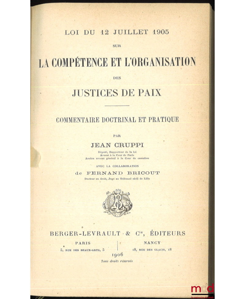 LA LOI DU 12 JUILLET 1905 SUR LA COMPÉTENCE ET L’ORGANISATION DES JUSTICES DE PAIX, Commentaire doctrinal et pratique