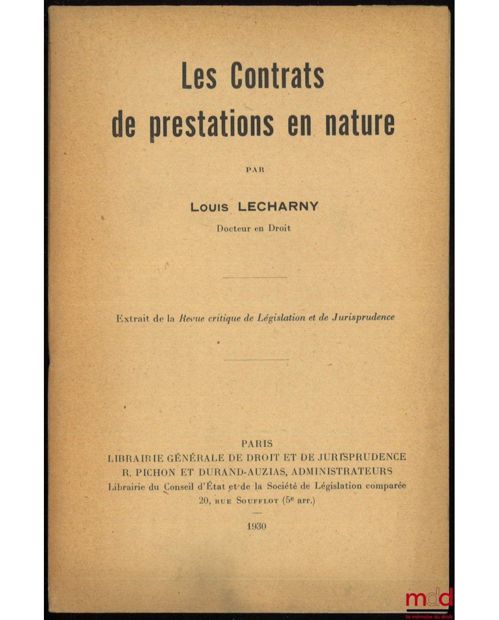 LES CONTRATS DE PRESTATIONS EN NATURE. Extrait de la Revue critique de Législation et de Jurisprudence