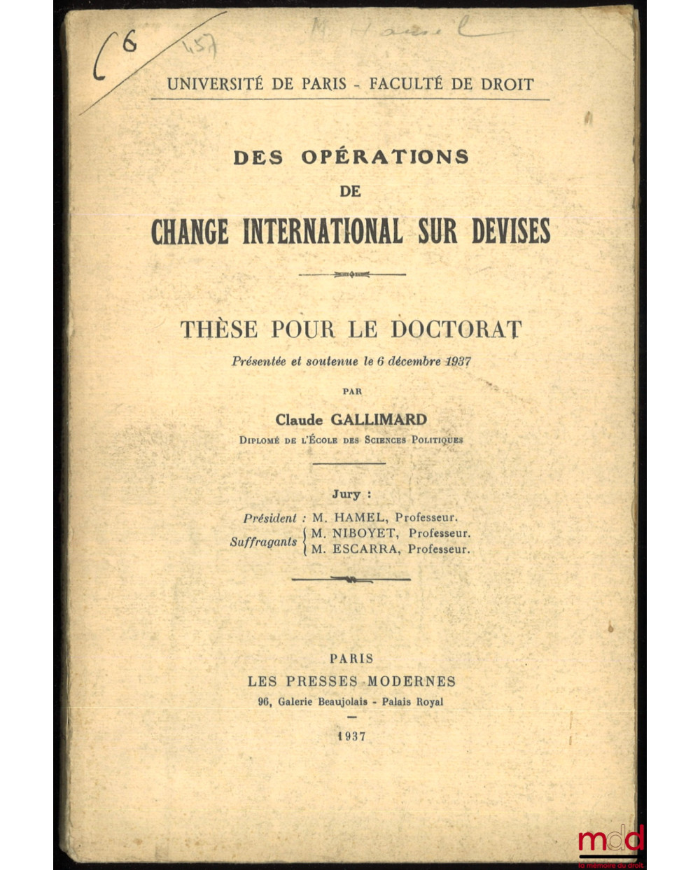 DES OPÉRATIONS DE CHANGE INTERNATIONAL SUR DEVISES. Thèse pour le doctorat présentée et soutenue le 6 décembre 1937, (Président : M. Hamel, Suffragants : M. Niboyet et M. Escarra)