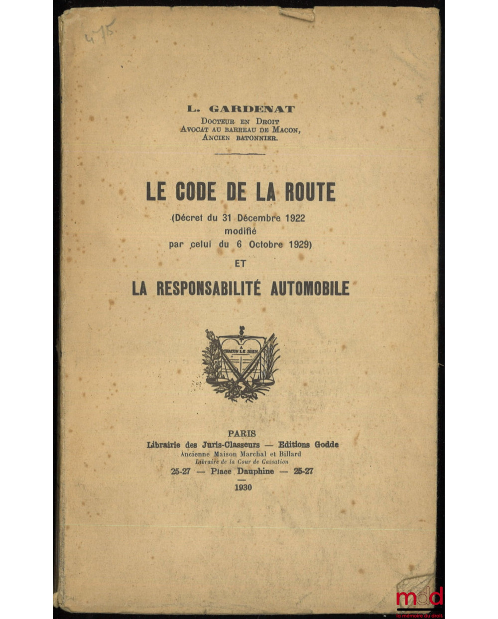 LE CODE DE LA ROUTE (Décret du 31 décembre 1922 modifié par celui du 6 octobre 1929) et LA RESPONSABILITÉ AUTOMOBILE