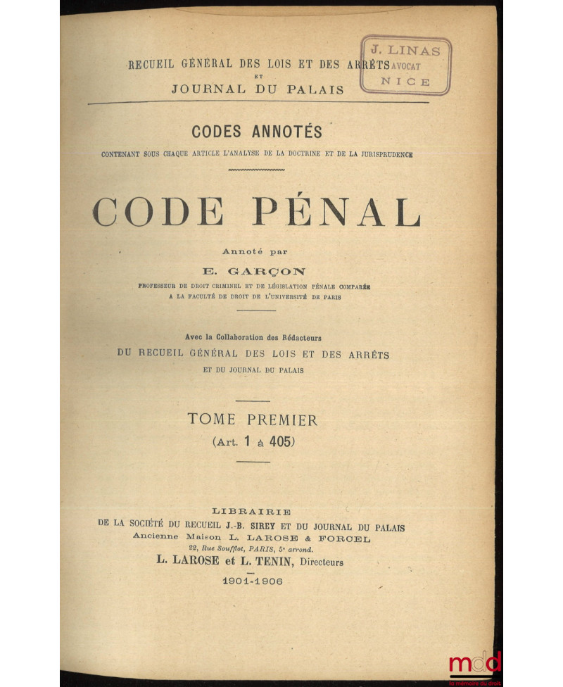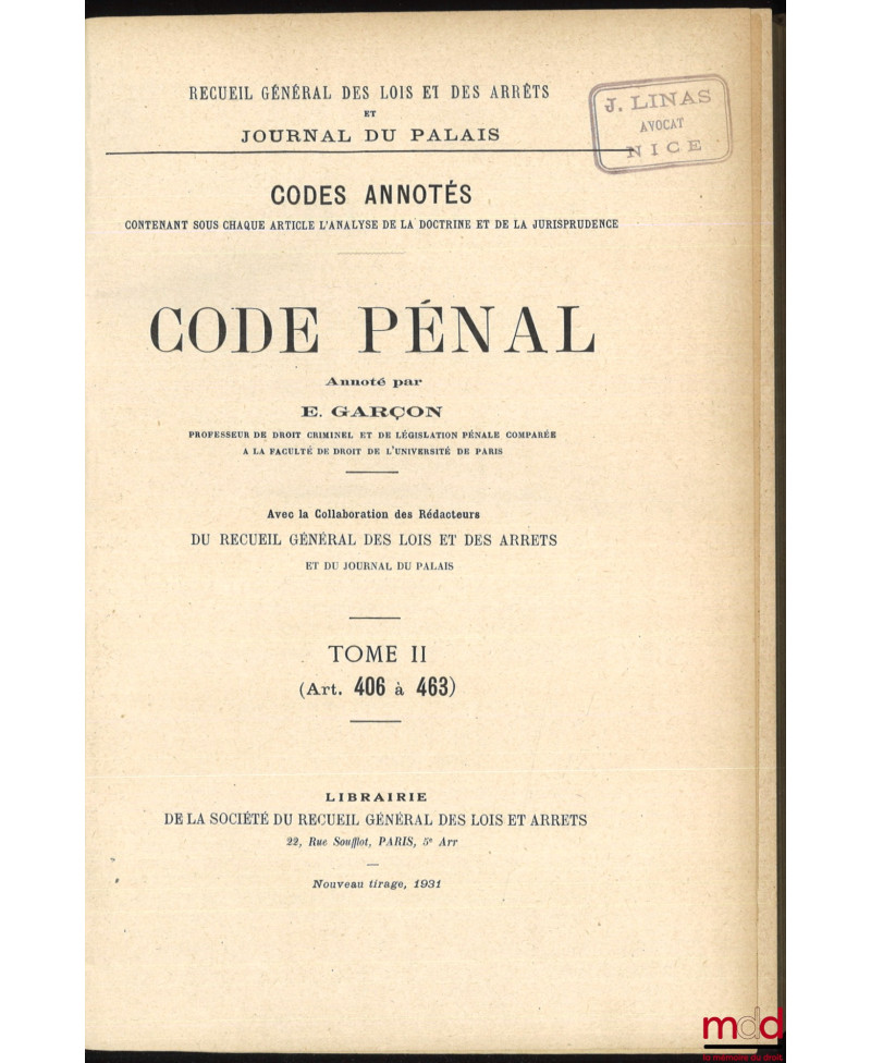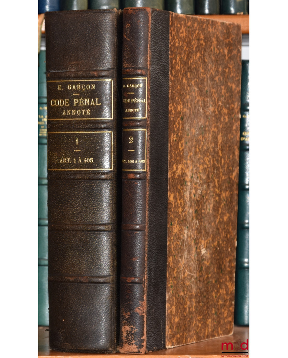 CODE PÉNAL ANNOTÉ, Recueil général des lois et des arrêts et Journal du Palais, Codes annotés contenant sous chaque article l’analyse de la doctrine et de la jurisprudence, avec la collaboration des rédacteurs du recueil général des lois et des arrêts et du Journal du Palais, [t. II nouveau tirage 1931]