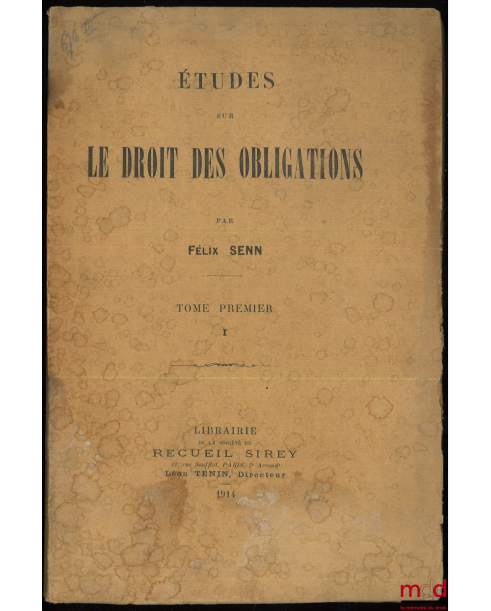 ÉTUDES SUR LE DROIT DES OBLIGATIONS, [t. I seul paru]