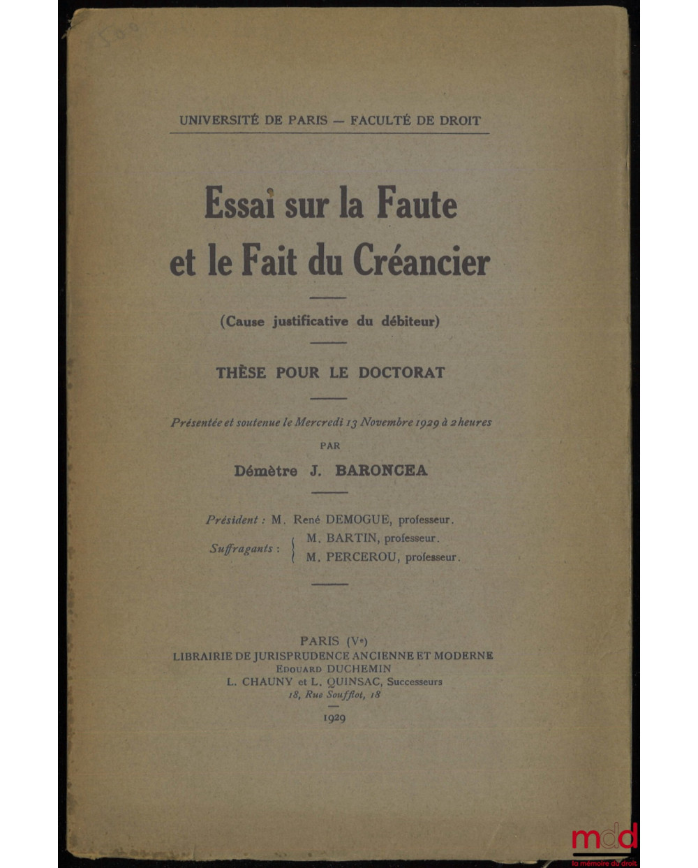ESSAI SUR LA FAUTE ET LE FAIT DU CRÉANCIER (CAUSE JUSTIFICATIVE DU DÉBITEUR). Thèse pour le Doctorat présentée le 13 novembre 1929, (Président : M. René Demogue, Suffragants : M. Bartin et M. Percerou)