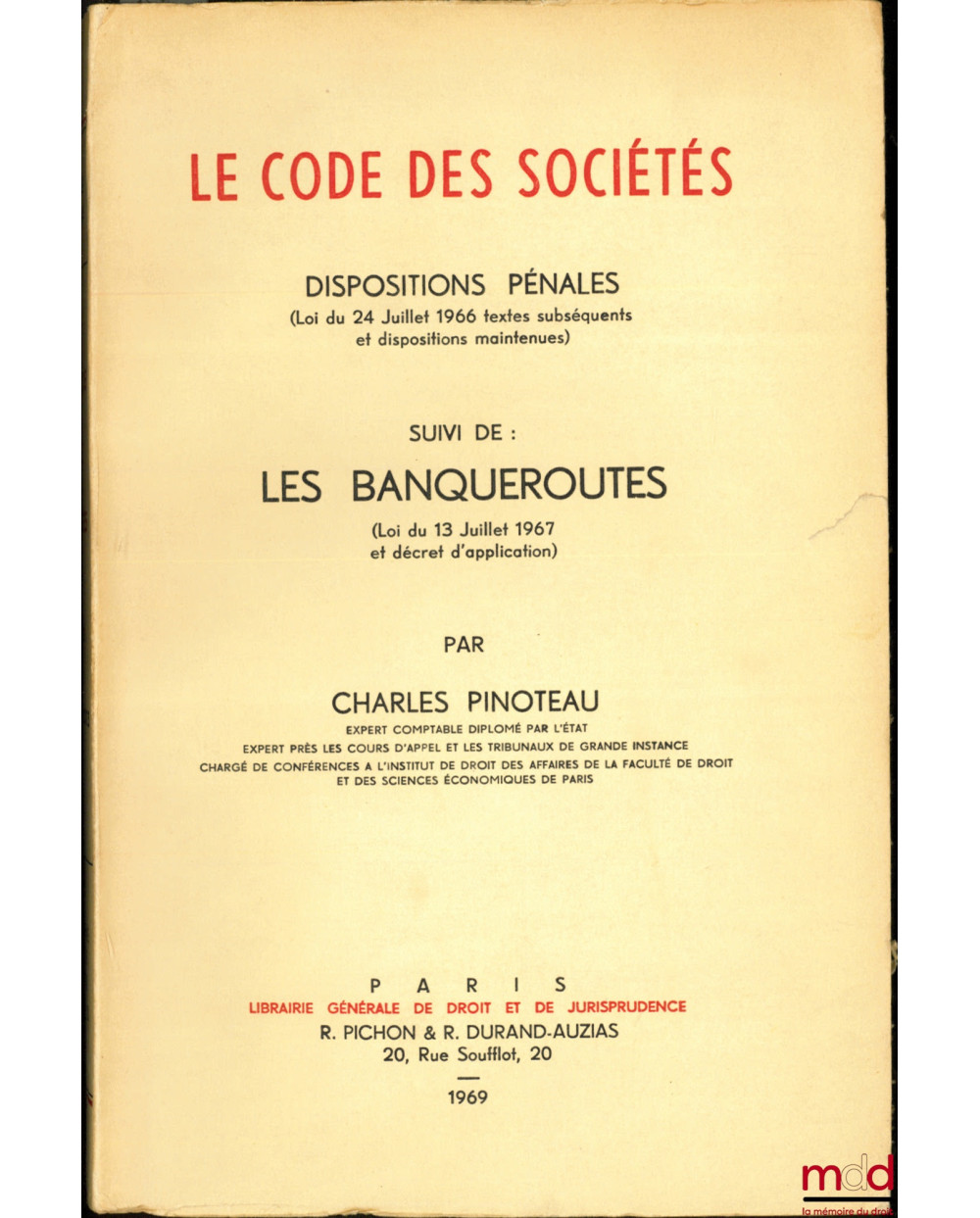LE CODE DES SOCIÉTÉS, DISPOSITIONS PÉNALES (Loi du 24 juillet 1966 textes subséquents et dispositions maintenues) suivi de : LES BANQUEROUTES (Loi du 13 juillet 1967 et décret d’application)