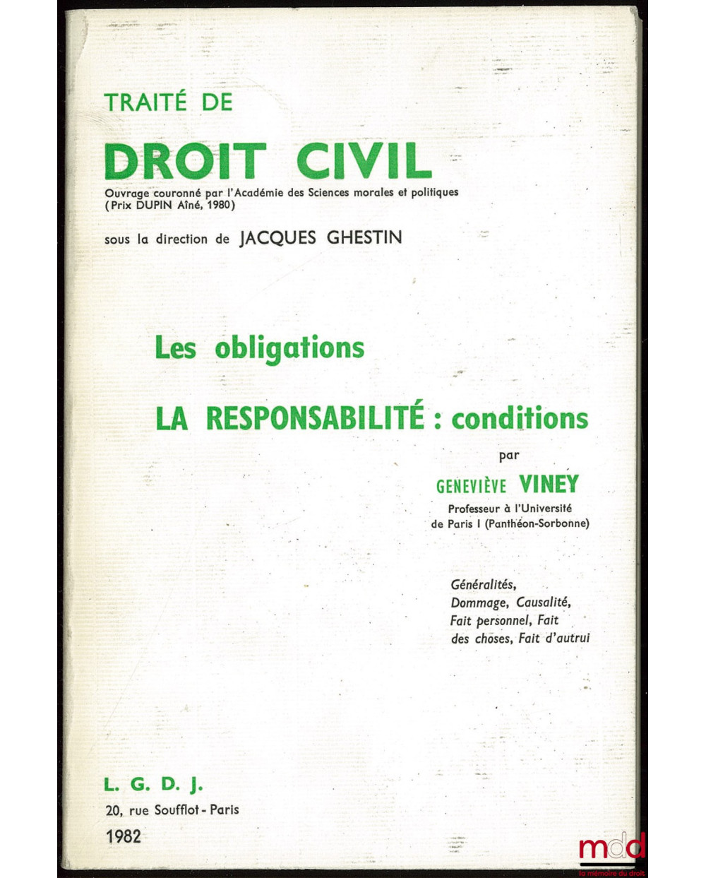 LES OBLIGATIONS. LA RESPONSABILITÉ : CONDITIONS (Généralités, Dommage, Causalité, Fait personnel, Fait des choses, Fait d’autrui), TRAITÉ DE DROIT CIVIL sous la direction de Jacques Ghestin, t. IV