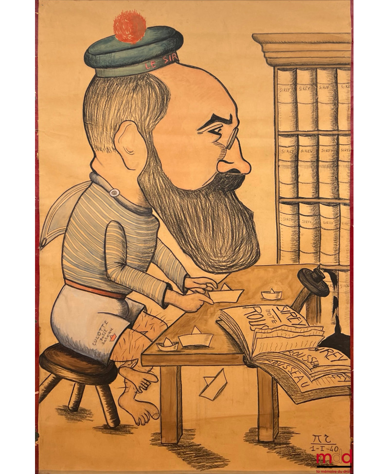 CARICATURE D’UN ÉTUDIANT DE DROIT EN CULOTTE COURTE (Petit Bateau) ET COIFFÉ D’UN BÉRET À POMPON, FAISANT DES PLIAGES AVEC LES PAGES DU CODE SIREY
