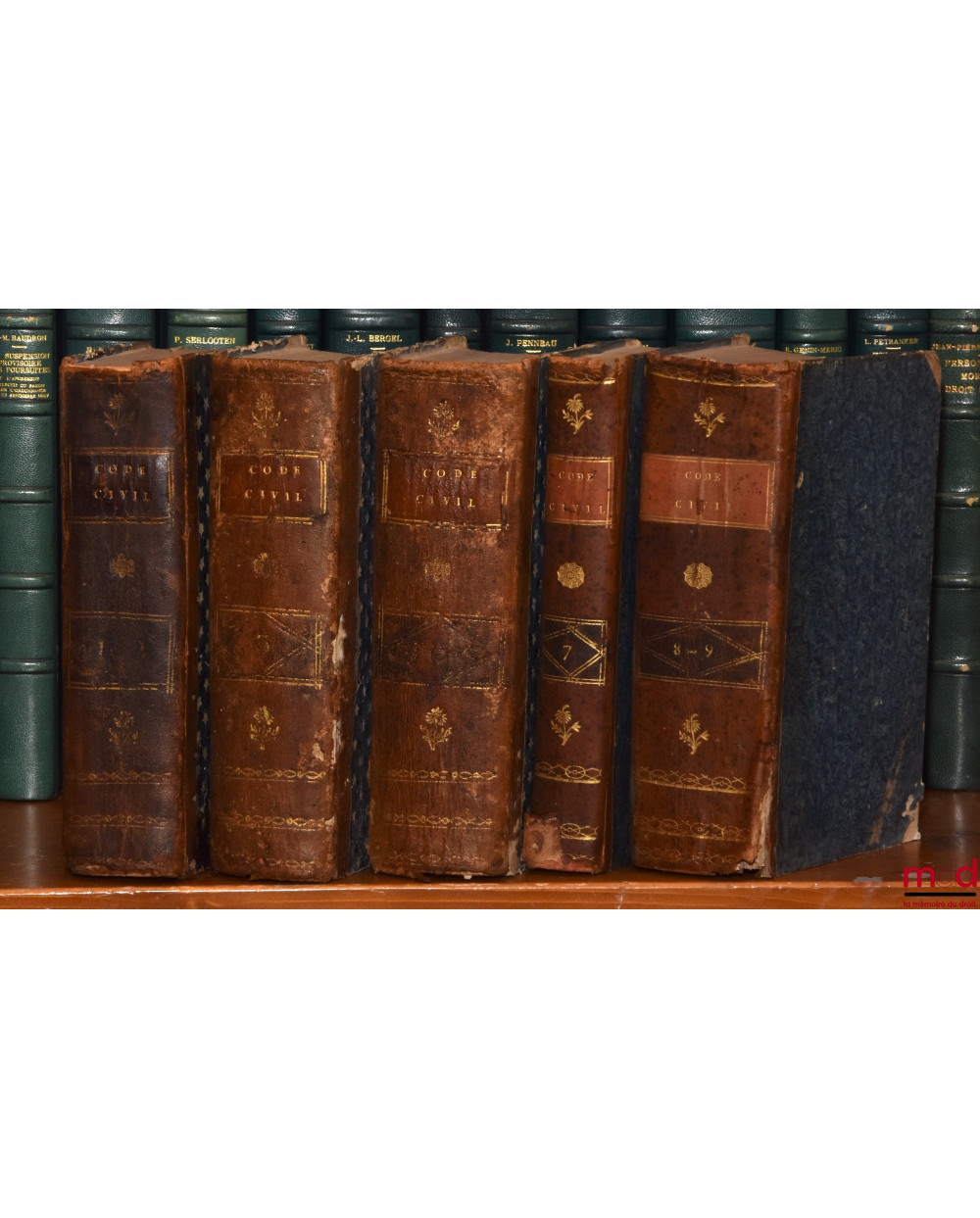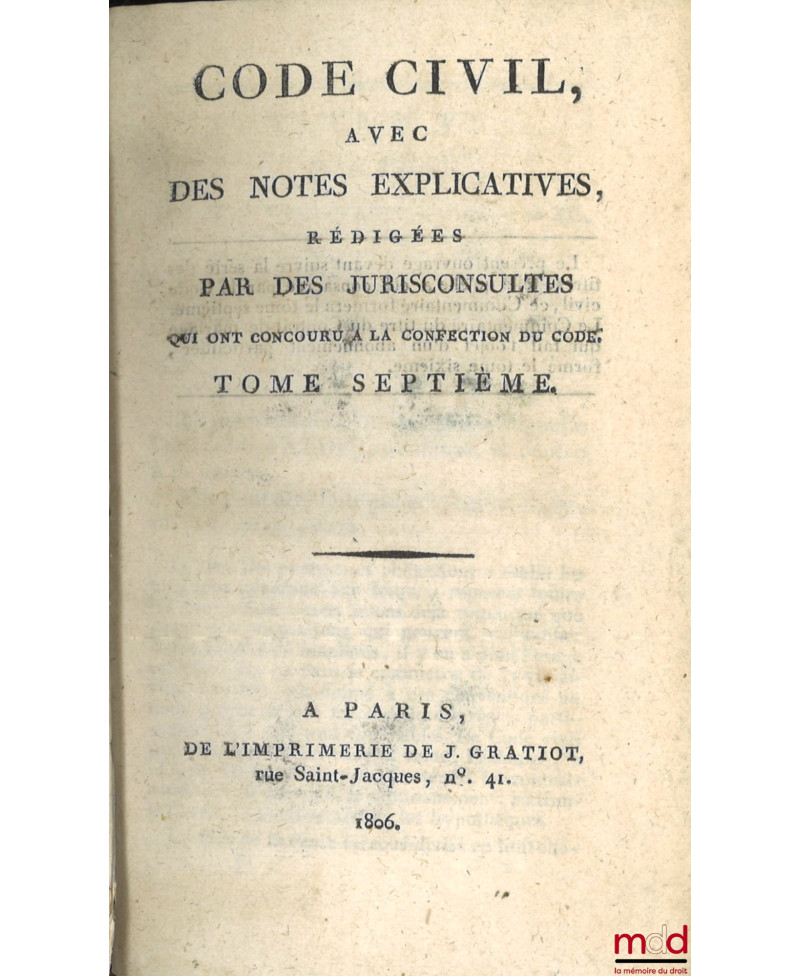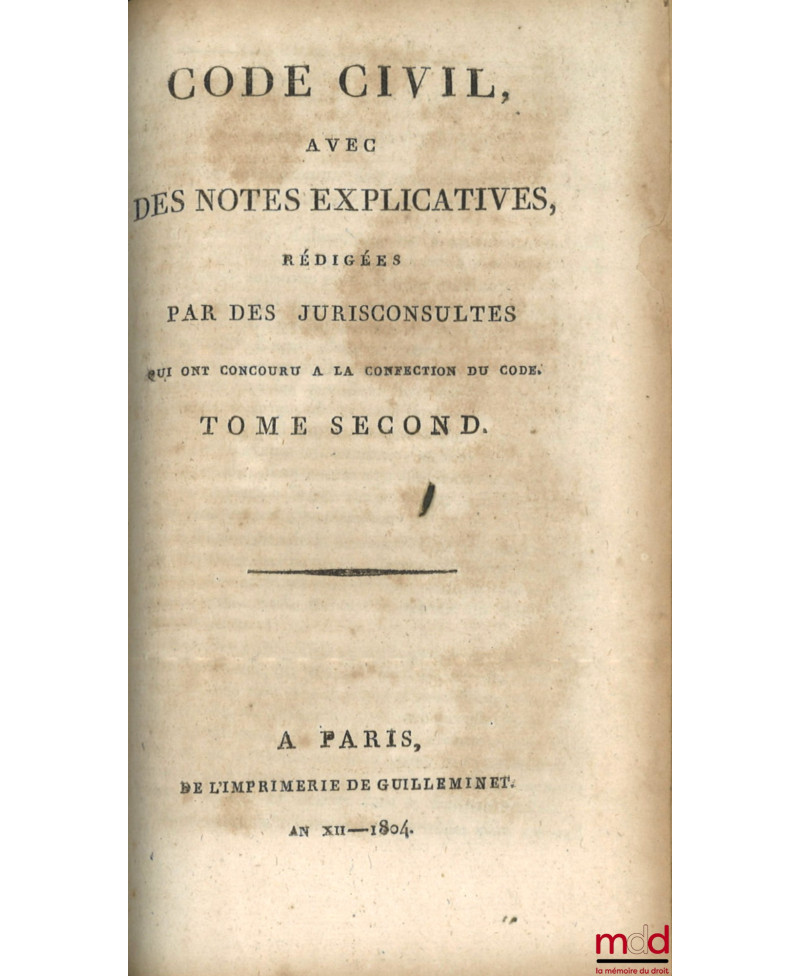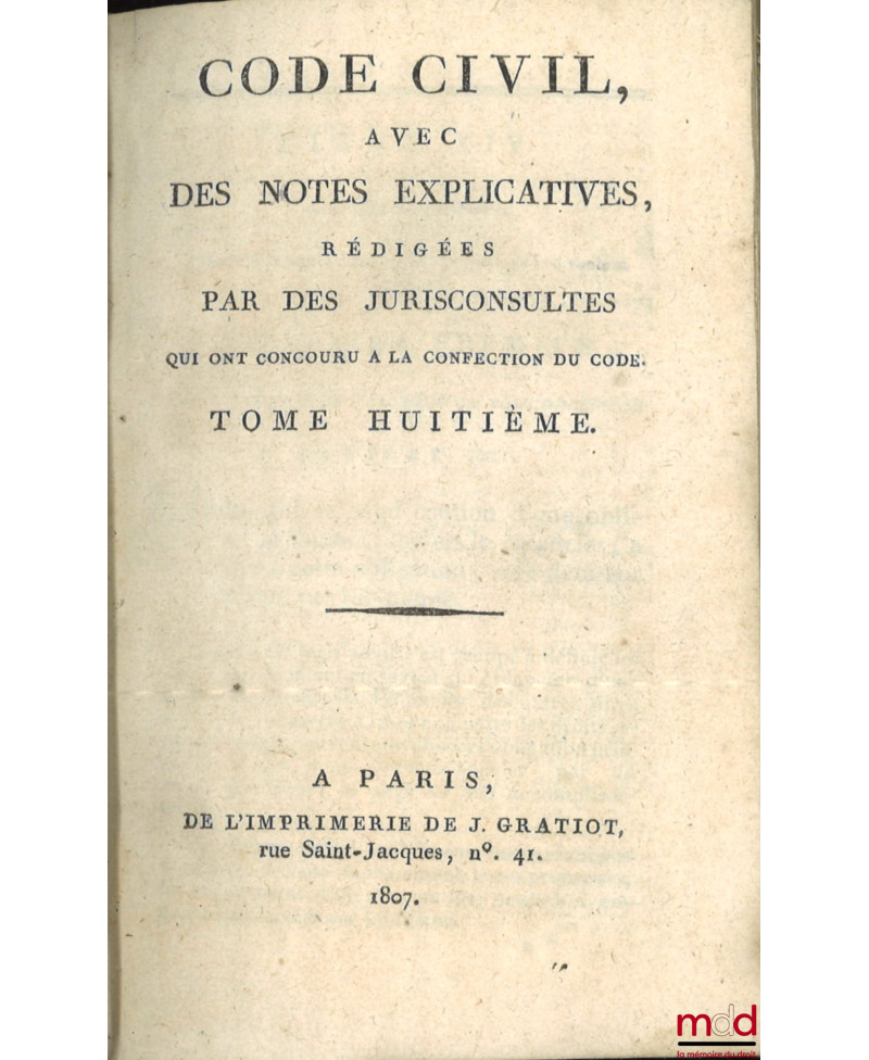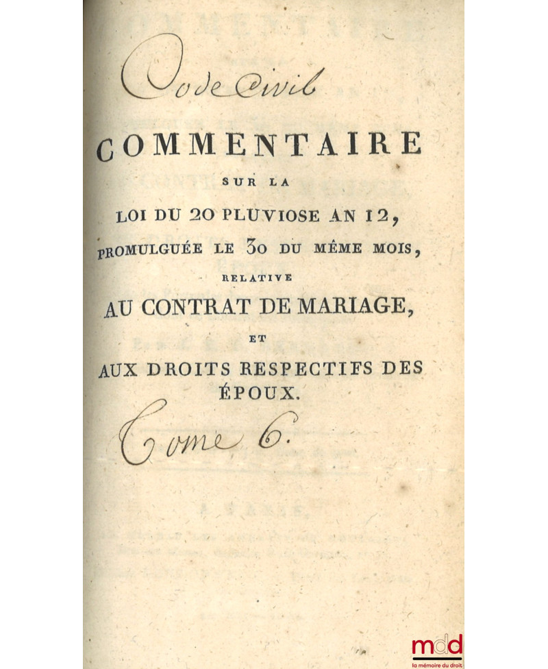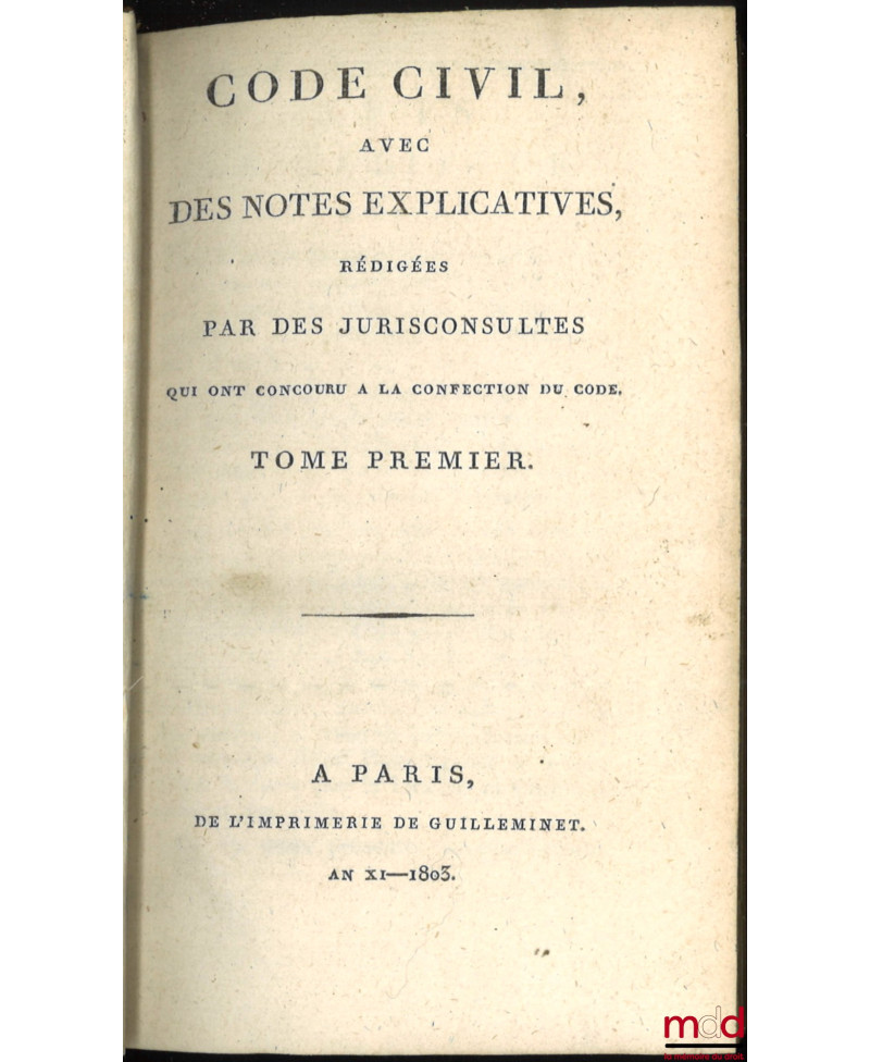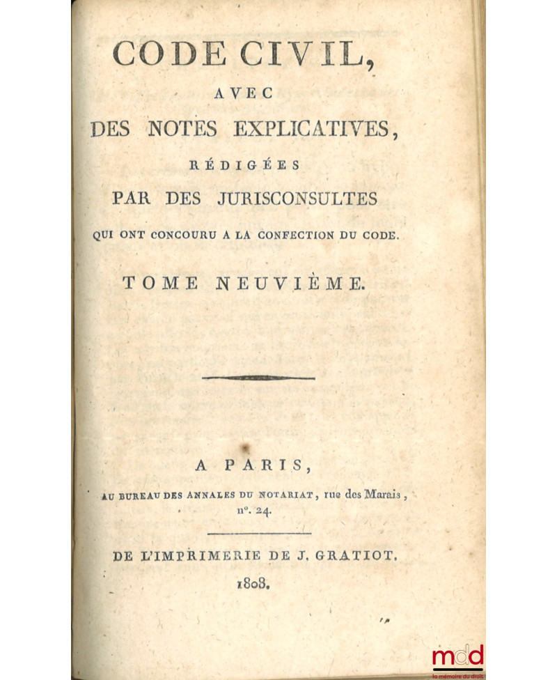 Tome premier : An XI–1803 (De l’imprimerie de Guilleminet, IV-526 p.) ;Tome second : An XII–1804 (De l’imprimerie de Guilleminet, 214 p.) ;Tome troisième : An XIII–1804 (De l’imprimerie de Guilleminet, IV-712 p.) ;Tome quatrième : An XII–1804. Commentaire sur la loi du 13 floréal An II, relative aux donations et aux testaments, par J.E.D. Bernadi (Au bureau des Annales du Notariat, rue des Marais, faubourg Saint-Germain, n° 23. Et chez Rondonneau, au Dépôt des Lois, place du Carrousel, 336 p.) ;Tome cinquième : 1806 (de l’imprimerie de J. Gratiot, rue Saint-Jacques, n° 41, 325 p.) ;Tome sixième : Commentaire sur la loi du 20 pluviose An 12, promulguée le 30 du même mois, relative au contrat de mariage et aux droits respectifs des époux, avec les formules des principales Conventions dont ce contrat est susceptible, par J.E.D. Bernadi (268 p.) ;Tome septième : 1806 (de l’imprimerie de J. Gratiot, rue Saint-Jacques, n° 41, 464 p.) ;Tome huitième : 1807 (de l’imprimerie de J. Gratiot, rue Saint-Jacques, n° 41, 583 p.) ;Tome neuvième : 1808 (de l’imprimerie de J. Gratiot, rue Saint-Jacques, n° 41, 668 p.).Collection rarissime et complète en neuf tomes de ce commentaire par article. Chacun fait l’objet de courtes observations rédigées par Chabot de l’Allier et J.E.D. Bernardi, jurisconsultes ayant participé aux travaux préparatoires. Les titres du Code sont précédés d’une introduction rapportant succinctement la législation antérieure sur les points de droit ayant été considérablement modifiés avec parfois un exposé des motifs de la loi.