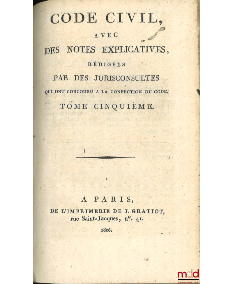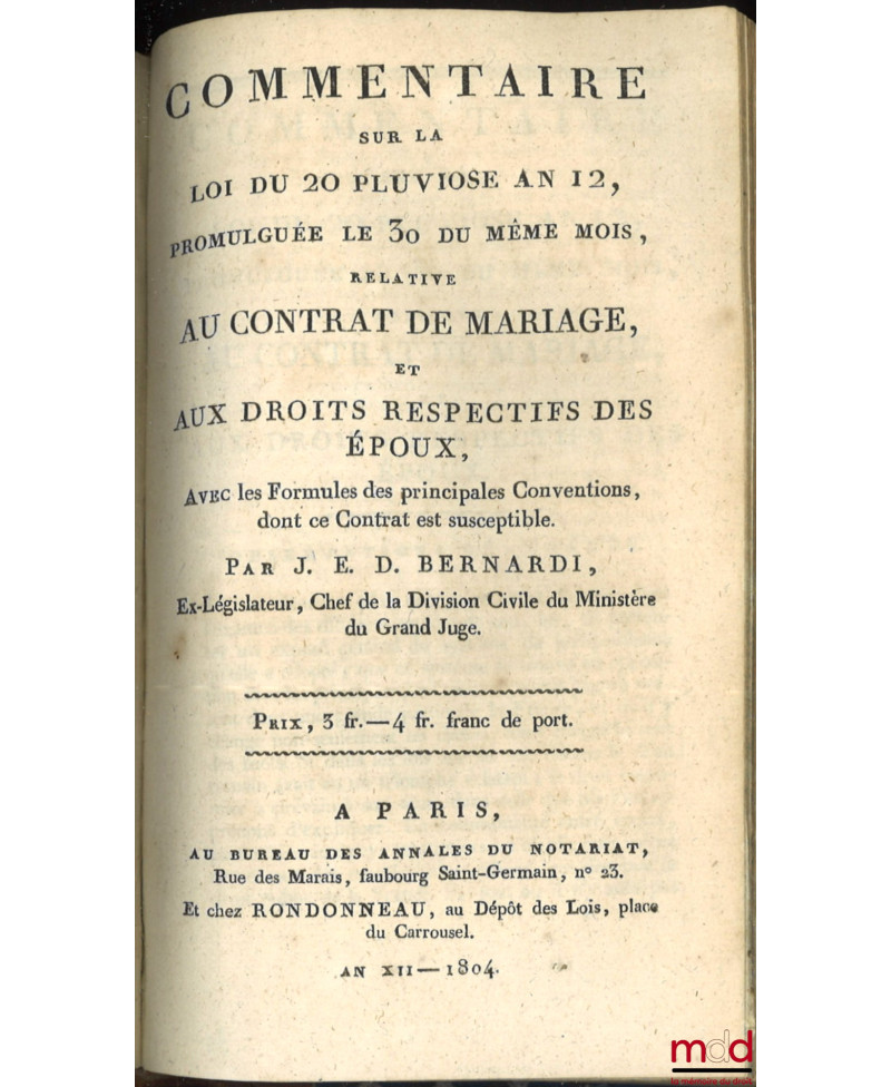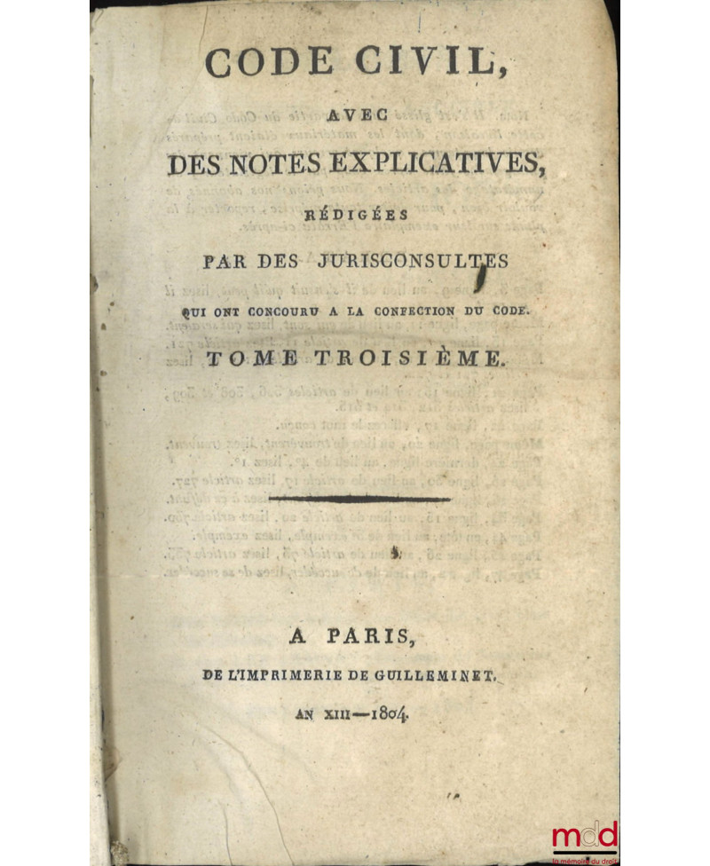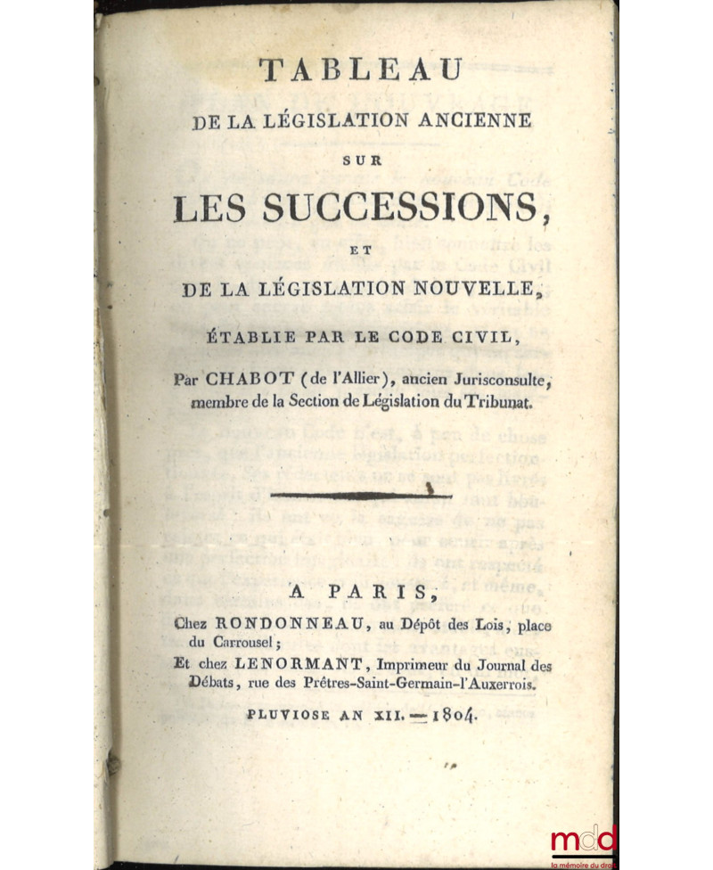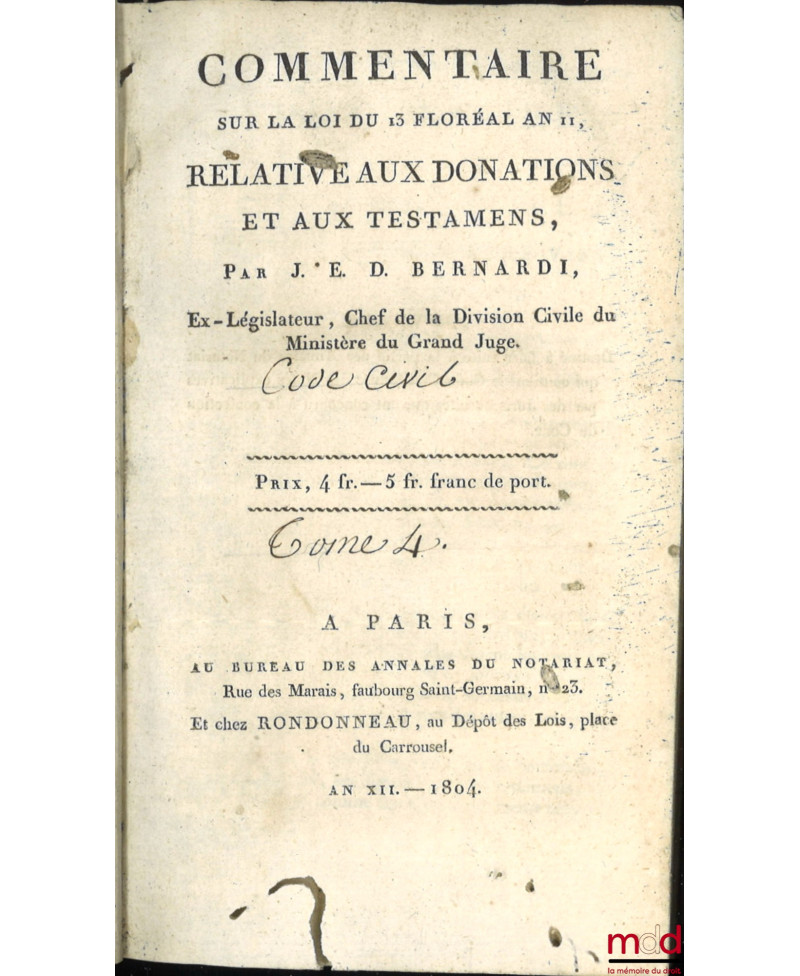 CODE CIVIL AVEC DES NOTES EXPLICATIVES RÉDIGÉES PAR DES JURISCONSULTES QUI ONT CONCOURU À LA CONFECTION DU CODE ;– Tableau de la législation ancienne sur les successions et de la législation nouvelle, établie par le Code civil, par Chabot (de l’Allier) ;– Commentaire sur la loi du 13 floréal An II, relative aux donations et aux testaments, par J.E.D. Bernadi ;– Commentaire sur la loi du 20 pluviose An 12, promulguée le 30 du même mois, relative au contrat de mariage et aux droits respectifs des époux, avec les formules des principales Conventions dont ce contrat est susceptible, par J.E.D. Bernadi