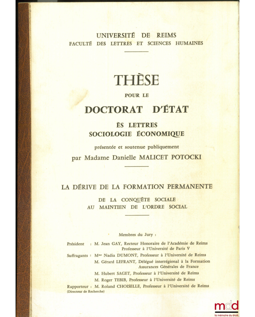 LA DÉRIVE DE LA FORMATION PERMANENTE - DE LA CONQUÊTE SOCIALE AU MAINTIEN DE L’ORDRE SOCIAL, Thèse es lettres sociologie économique, université de Reim