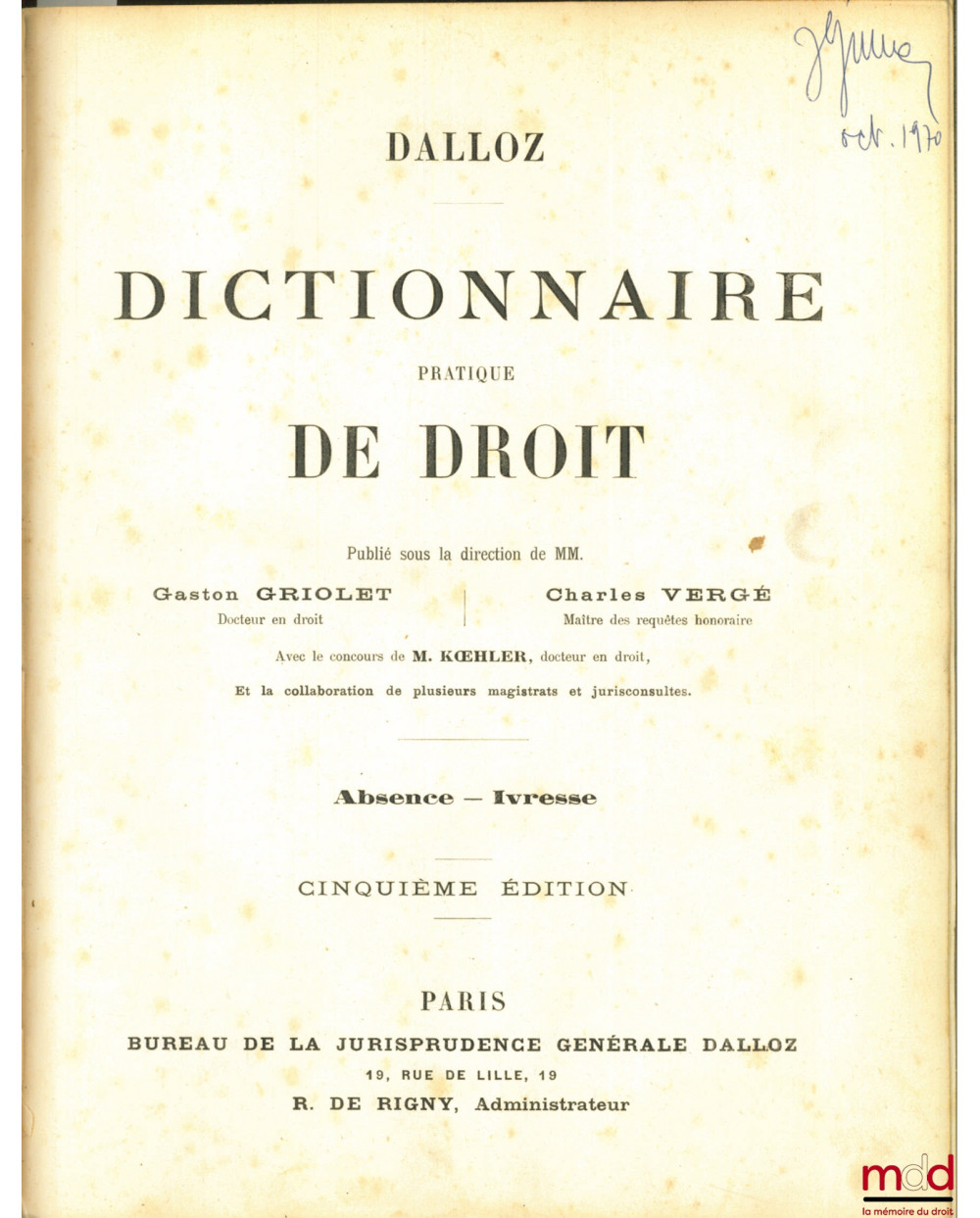 DICTIONNAIRE PRATIQUE DE DROIT DALLOZ, 5ème éd. et Additions 1917