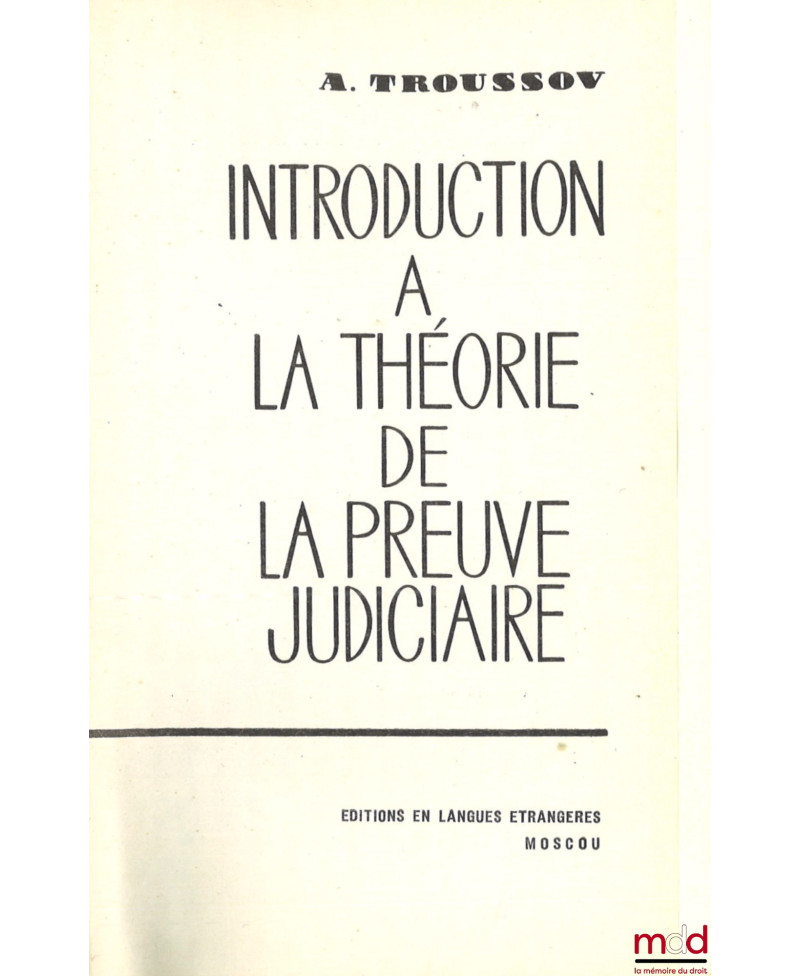 INTRODUCTION A LA THÉORIE DE LA PREUVE JUDICIAIRE, Traduit du russe par L. Piatigorski