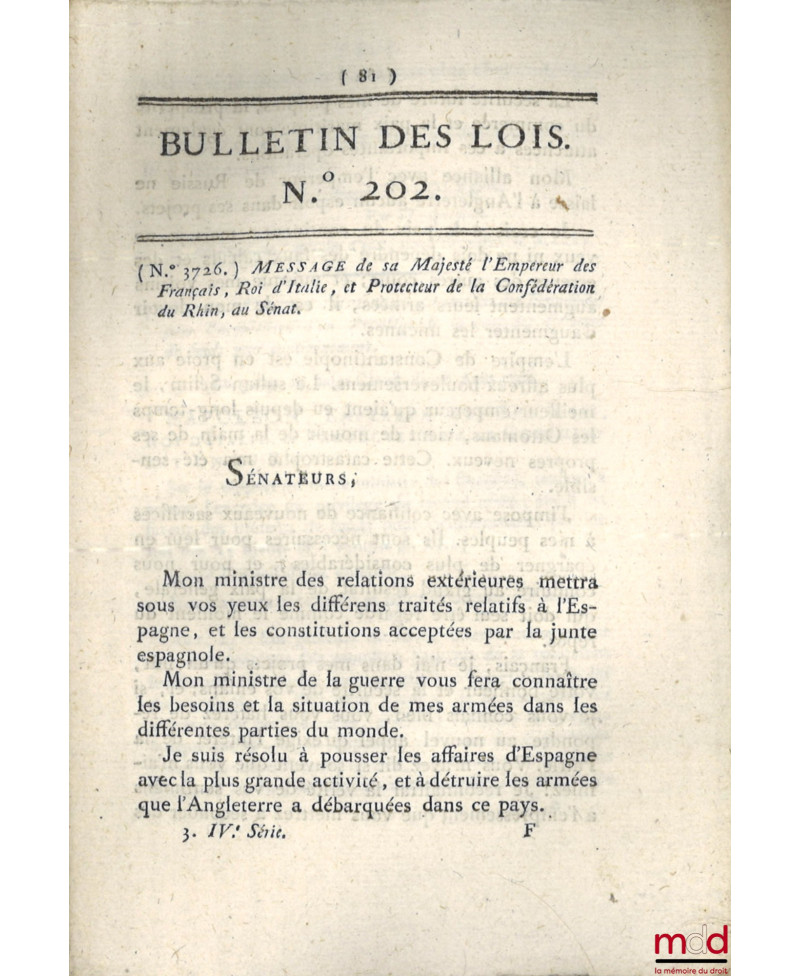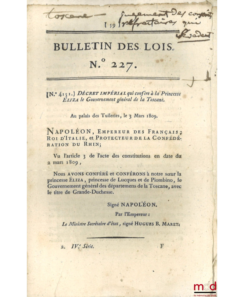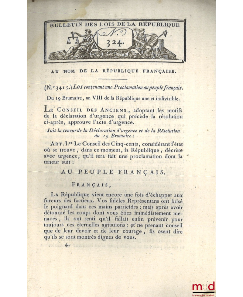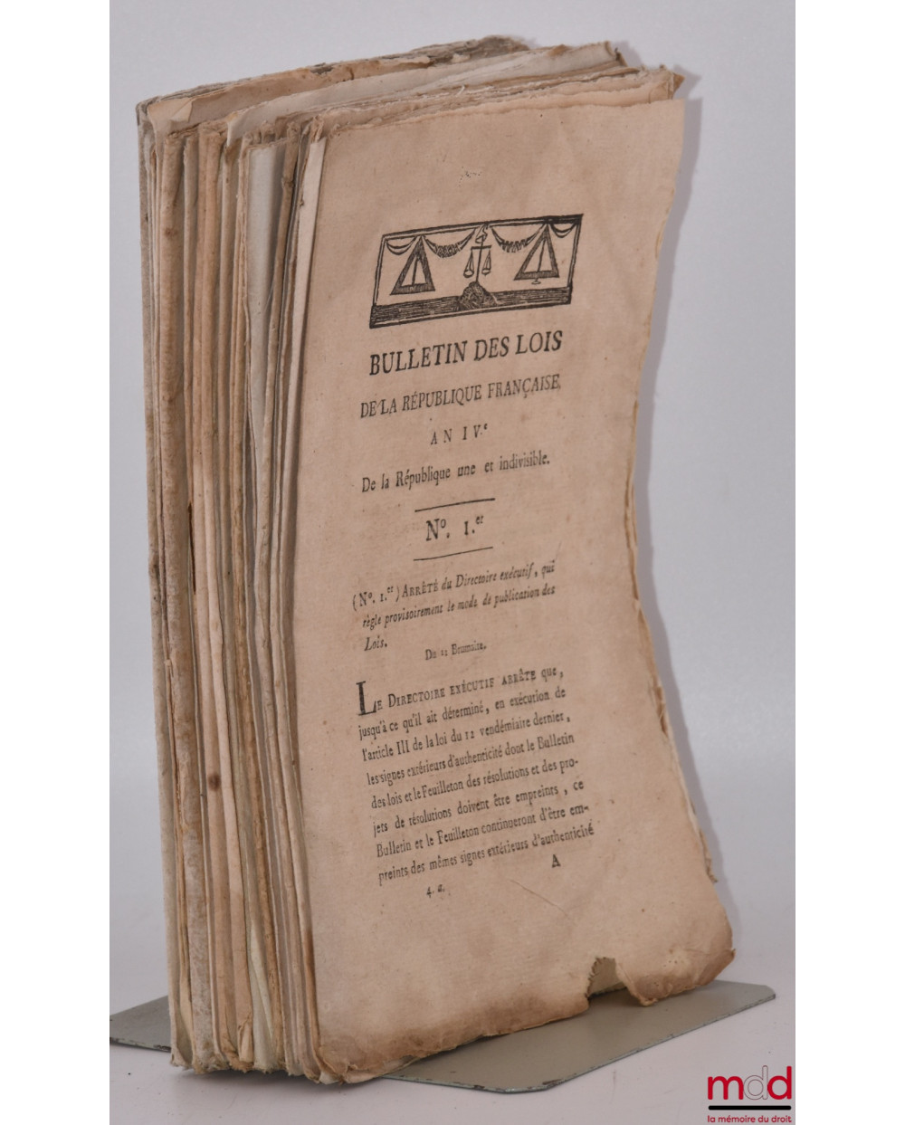 ENSEMBLE DE 18 BULLETINS DES LOIS :Bulletin des lois de la République française, Arrêté du Directoire exécutif qui règle provisoirement le mode de publication des Lois, Arrêtés de nomination des ministres, Proclamation du directoire exécutif aux français, An IV, [8 p.] ;Bulletin des lois de la République n° 158, Proclamation du Directoire exécutif au français, 1er frimaire An VI, [4 p.] ;Bulletin des lois de la République n° 304, Proclamation du Directoire exécutif aux français (n° 3238), 17 fructidor An VII, [8 p.] ;Bulletin des lois de la République n° 324, Loi contenant une Proclamation au peuple français (n° 3415), 19 brumaire An VIII, [4 p.] ;Bulletin des lois de la République n° 9, Proclamation (n° 62), 17 Ventôse An VIII, [16 p.] ;Bulletin des lois n° 202, Messages de sa Majesté l’Empereur des Français, Roi d’Italie, et protecteur de la Confédération du Rhin au Sénat (n° 3726), 14 septembre 1808, [8 p.] ;Rapport fait au nom de la Commission des finances par M. de Montesquiou sur le projet de loi concernant les finances, Séance du 25 novembre 1808, [35 p.] ;Bulletin des lois n° 227, Décret impérial qui confère à la Princesse Eliza le Gouvernement général de la Toscane (n° 4151), 3 mars 1809, [16 p.] ;Bulletin des lois n° 405, novembre 1811, [16 p.] ;Bulletin des lois n° 408, Décret impérial portant Abolition de la Féodalité dans les départements des Bouches-de-l’Elbe, des Bouches-du-Weser et de l’Ems-supérieur, 9 déc. 1811, [32 p.] ;Bulletin des lois n° 2, Arrêté du Gouvernement provisoire concernant la police des Placards, Affiches et Feuilles publiques (n° 17), 7 avril 1814, [15 p.] ;Bulletin des lois n° 19, Ordonnance du roi qui maintient provisoirement les Lois, Décrets et Règlements par lesquels il a été pourvu jusqu’à ce jour à la répression des abus de la Presse, 10 juin 1814, [8 p.] ;Bulletin des lois n° 60, Loi sur les boissons (n° 504), 8 déc. 1814, [40 p.] ;Bulletin des lois n° 25, Décret impérial qui rapporte les Ordonnances des 31 mai, 14 août et 23 décembre 1814, relatives à l’Établissement et l’Organisation d’une Garde de police de Paris, et qui ordonne que la Garde actuelle de cette ville reprendra la dénomination de Gendarmerie impériale (n° 128), 14 avril 1815, [8 p.] ;Bulletin des lois n° 30, 1815, [8 p.] ;Bulletin des lois de n° 28, Décret impérial contenant différentes dispositions tendant à réprimer les Manoeuvres qui pourraient troubler l’ordre public (n° 149), 1815, [4 p.] ;Bulletin des lois, 2e partie, Ordonnances, n° 369 (1re section), 1835, [7 p.] ;Bulletin des lois, 2e partie, Ordonnances, n° 372 (1re section), 1835, [26 p.]