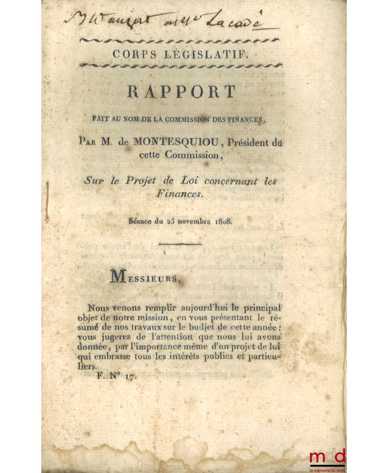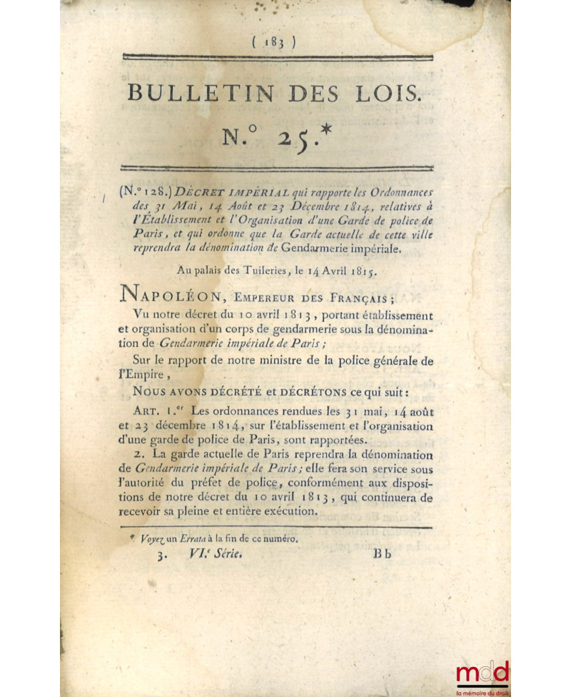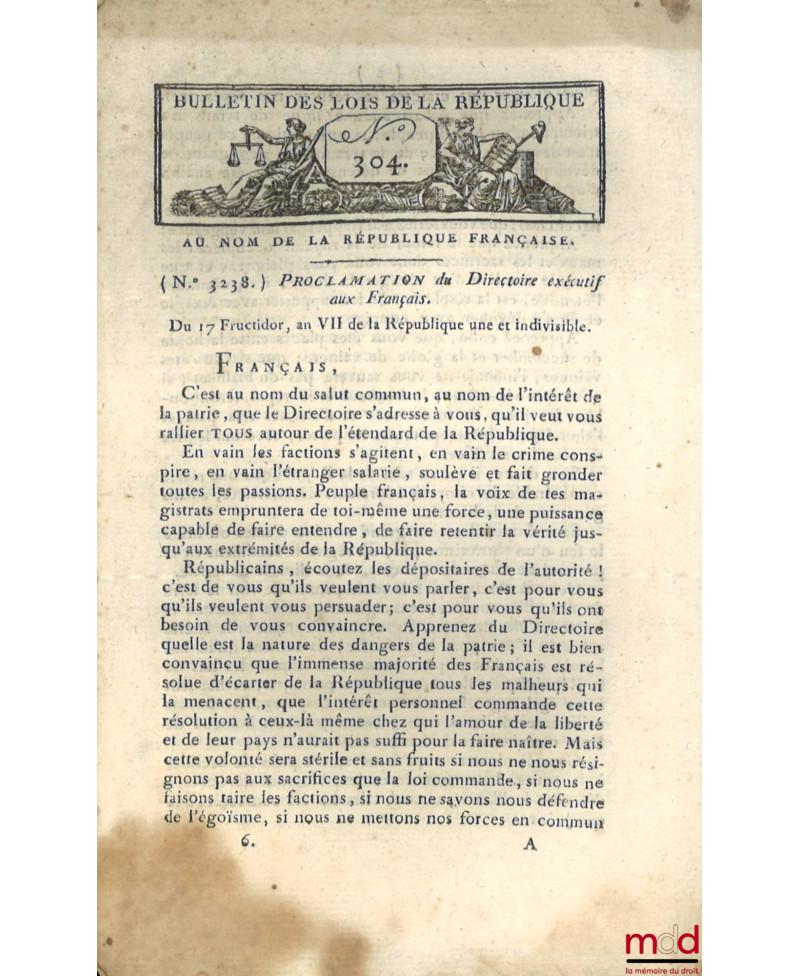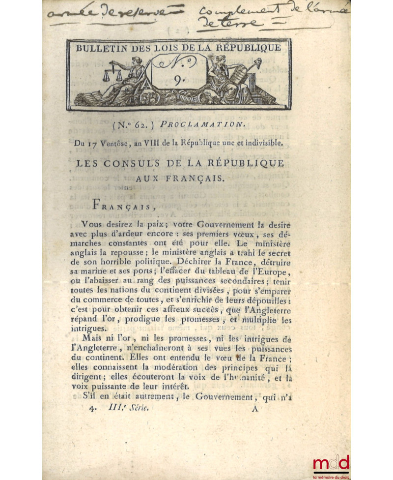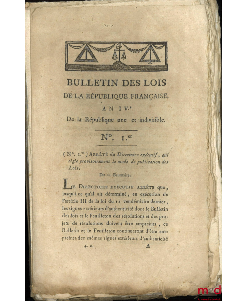 ENSEMBLE DE 18 BULLETINS DES LOIS :Bulletin des lois de la République française, Arrêté du Directoire exécutif qui règle provisoirement le mode de publication des Lois, Arrêtés de nomination des ministres, Proclamation du directoire exécutif aux français, An IV, [8 p.] ;Bulletin des lois de la République n° 158, Proclamation du Directoire exécutif au français, 1er frimaire An VI, [4 p.] ;Bulletin des lois de la République n° 304, Proclamation du Directoire exécutif aux français (n° 3238), 17 fructidor An VII, [8 p.] ;Bulletin des lois de la République n° 324, Loi contenant une Proclamation au peuple français (n° 3415), 19 brumaire An VIII, [4 p.] ;Bulletin des lois de la République n° 9, Proclamation (n° 62), 17 Ventôse An VIII, [16 p.] ;Bulletin des lois n° 202, Messages de sa Majesté l’Empereur des Français, Roi d’Italie, et protecteur de la Confédération du Rhin au Sénat (n° 3726), 14 septembre 1808, [8 p.] ;Rapport fait au nom de la Commission des finances par M. de Montesquiou sur le projet de loi concernant les finances, Séance du 25 novembre 1808, [35 p.] ;Bulletin des lois n° 227, Décret impérial qui confère à la Princesse Eliza le Gouvernement général de la Toscane (n° 4151), 3 mars 1809, [16 p.] ;Bulletin des lois n° 405, novembre 1811, [16 p.] ;Bulletin des lois n° 408, Décret impérial portant Abolition de la Féodalité dans les départements des Bouches-de-l’Elbe, des Bouches-du-Weser et de l’Ems-supérieur, 9 déc. 1811, [32 p.] ;Bulletin des lois n° 2, Arrêté du Gouvernement provisoire concernant la police des Placards, Affiches et Feuilles publiques (n° 17), 7 avril 1814, [15 p.] ;Bulletin des lois n° 19, Ordonnance du roi qui maintient provisoirement les Lois, Décrets et Règlements par lesquels il a été pourvu jusqu’à ce jour à la répression des abus de la Presse, 10 juin 1814, [8 p.] ;Bulletin des lois n° 60, Loi sur les boissons (n° 504), 8 déc. 1814, [40 p.] ;Bulletin des lois n° 25, Décret impérial qui rapporte les Ordonnances des 31 mai, 14 août et 23 décembre 1814, relatives à l’Établissement et l’Organisation d’une Garde de police de Paris, et qui ordonne que la Garde actuelle de cette ville reprendra la dénomination de Gendarmerie impériale (n° 128), 14 avril 1815, [8 p.] ;Bulletin des lois n° 30, 1815, [8 p.] ;Bulletin des lois de n° 28, Décret impérial contenant différentes dispositions tendant à réprimer les Manoeuvres qui pourraient troubler l’ordre public (n° 149), 1815, [4 p.] ;Bulletin des lois, 2e partie, Ordonnances, n° 369 (1re section), 1835, [7 p.] ;Bulletin des lois, 2e partie, Ordonnances, n° 372 (1re section), 1835, [26 p.]