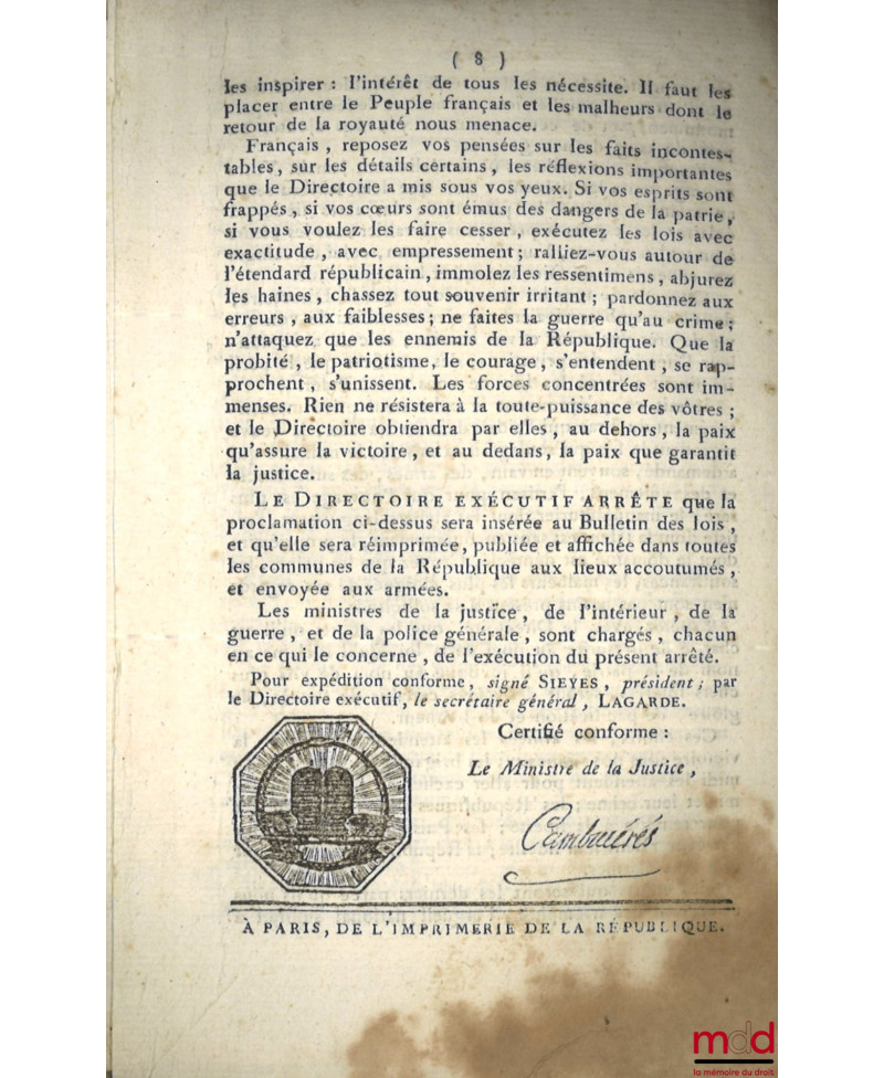 [Coup d’État des 18 et 19 brumaire An VIII, Constitution de l’An IV, divers]