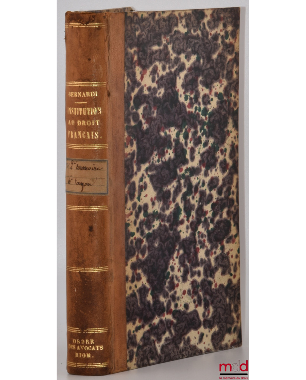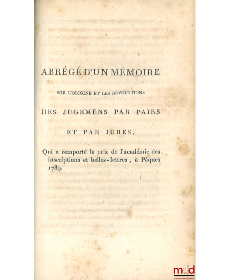 INSTITUTION AU DROIT FRANÇOIS CIVIL ET CRIMINEL ; OU TABLEAU RAISONNÉ DE L’ÉTAT ACTUEL DE LA JURISPRUDENCE FRANÇOISE ; Précédé d'une Introduction où l'on établit les principes fondamentaux du droit, de la justice et de la propriété : et suivi d'un mémoire sur l'origine et les révolutions des jugemens par Paris et par Jurés en France et en Angleterre, qui a remporté le prix de l'Académie des Inscriptions, 2e éd. où l’on trouve les changements faits dans la législation depuis le 18 brumaire.ABRÉGÉ D’UN MÉMOIRE SUR L’ORIGINE ET LES RÉVOLUTIONS DES JUGEMENTS PAR PAIRS ET PAR JURÉS, Qui a remporté le prix de l’académie des inscriptions et belles-lettres, à Pâques 1789.