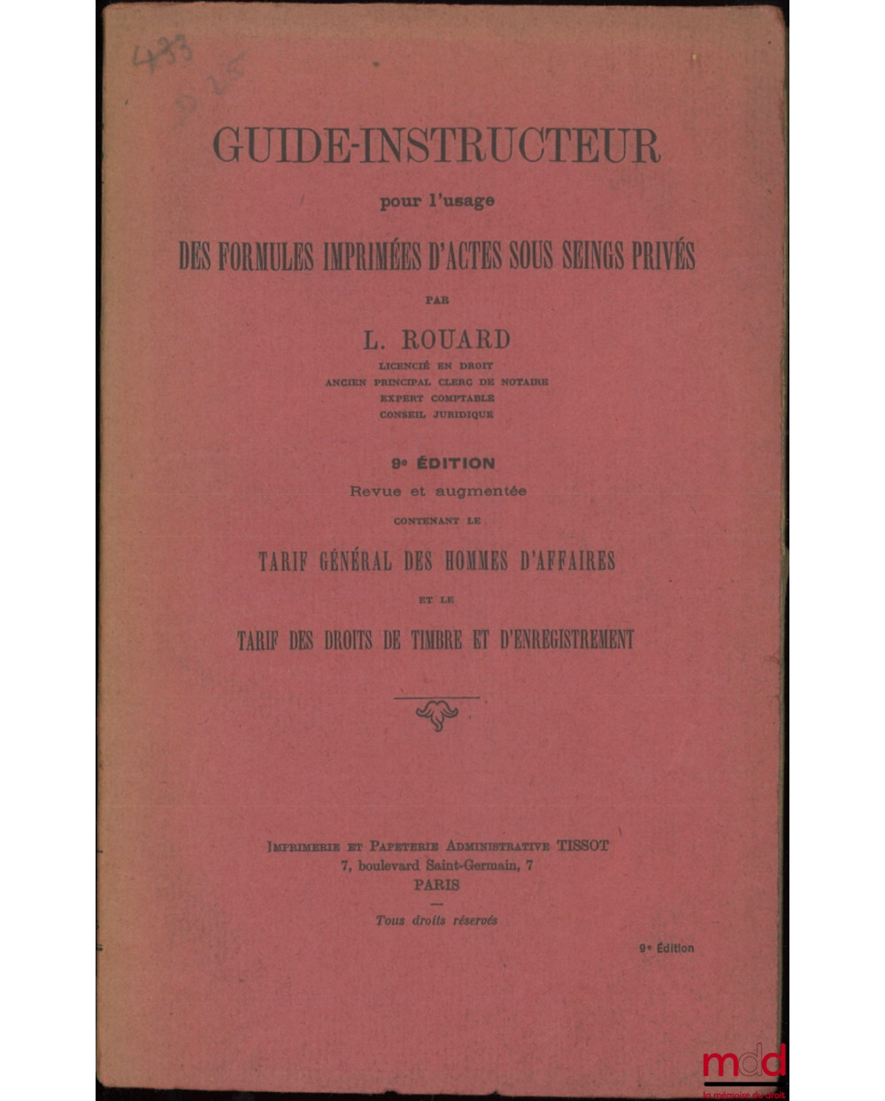 GUIDE-INSTRUCTEUR pour l’usage des formules imprimées d’actes sous seings privés, 9e éd. Revue et augmentée contenant le tarif général des hommes d’affaires et le tarif dont des droits de timbre et d’enregistrement [et] COMPLÉMENTS