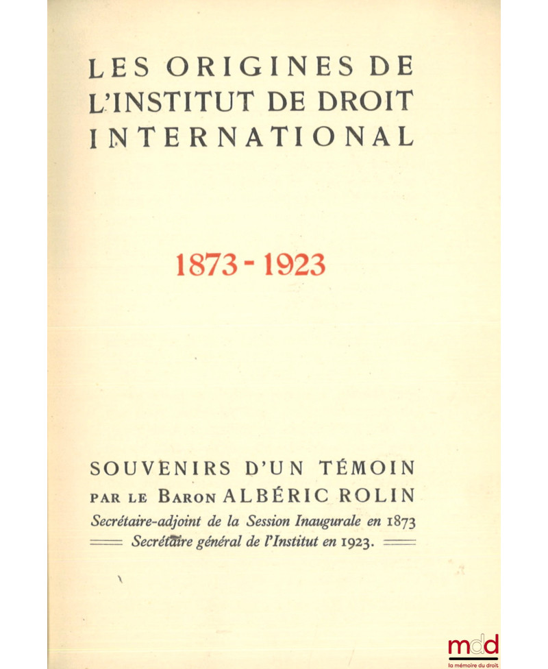 LES ORIGINES DE L’INSTITUT DE DROIT INTERNATIONAL, 1873-1923, Souvenirs d’un témoin