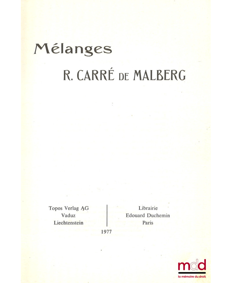 MÉLANGES R. CARRÉ DE MALBERG, [réimpression de l’éd. de 1933]