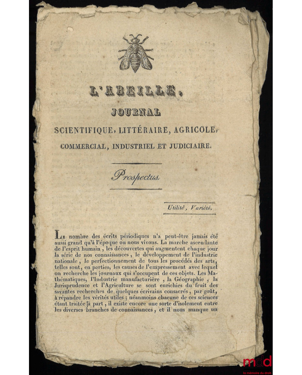 L’ABEILLE, Journal scientifique, littéraire, agricole, commercial, industriel et judiciaire, PROSPECTUS et POÉSIE, [n° 1]
