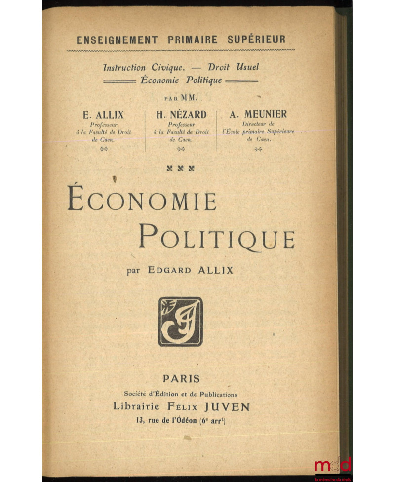 ÉCONOMIE POLITIQUE, coll. Enseignement primaire supérieur, Instruction Civique. – Droit usuel, Économie Politique par MM. É. Allix, H. Nézard et A. Meunier
