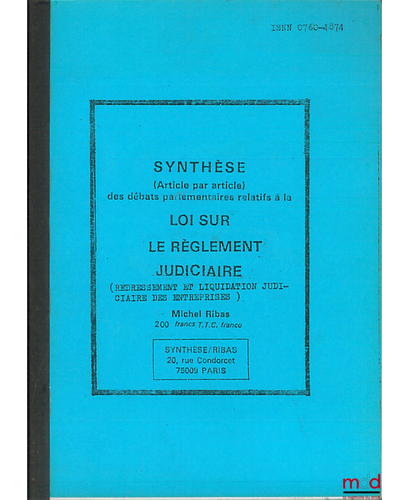 SYNTHÈSE (article par article) DES DÉBATS PARLEMENTAIRES RELATIFS À LA LOI SUR LE RÈGLEMENT JUDICIAIRE (Redressement et liquidation judiciaires des entreprises)