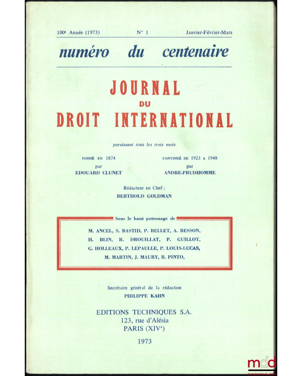 JOURNAL DU DROIT INTERNATIONAL, Numéro du centenaire, 100e Année (1973), n° 1, Janvier-Février-Mars