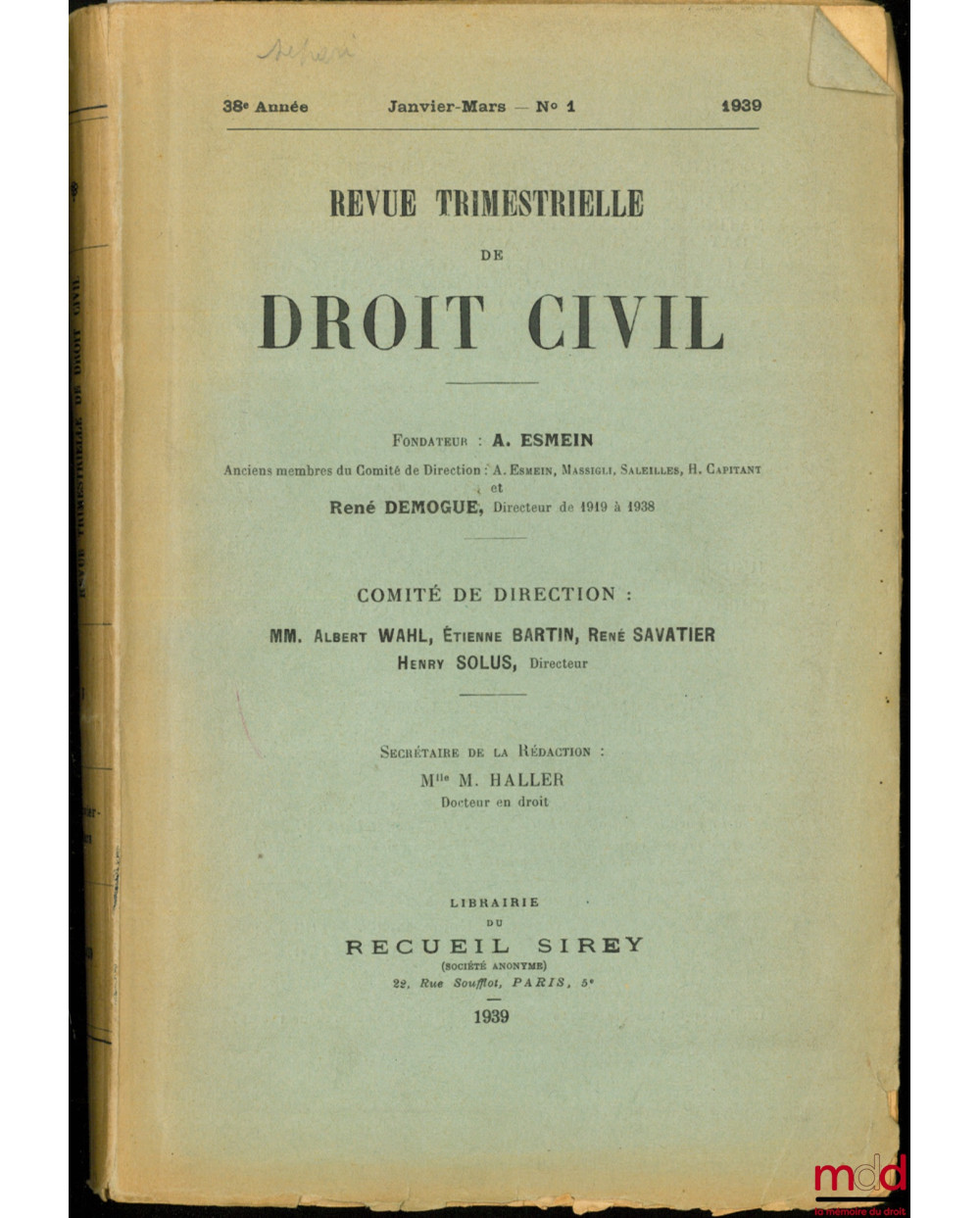 REVUE TRIMESTRIELLE DE DROIT CIVIL, 38e année, janvier-mars n° 1, année 1939