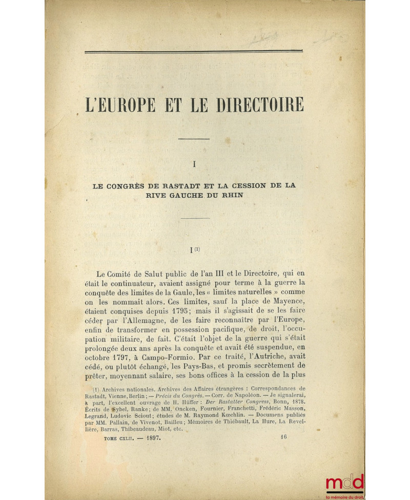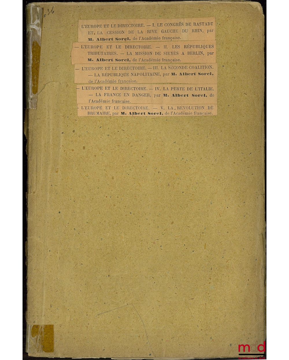 Revue des Deux Mondes, extraits des t. CXLII, CXLIII, CXLIV, CXLV : L’EUROPE ET LE DIRECTOIRE. I- Le congrès de Rastadt et la cession de la rive gauche du Rhin ; II- Les républiques tributaires - La mission de Sieyès à Berlin ; III- La seconde coalition - La république napolitaine ; IV- La perte de l’Italie - La France en danger ; V- La révolution de Brumaire