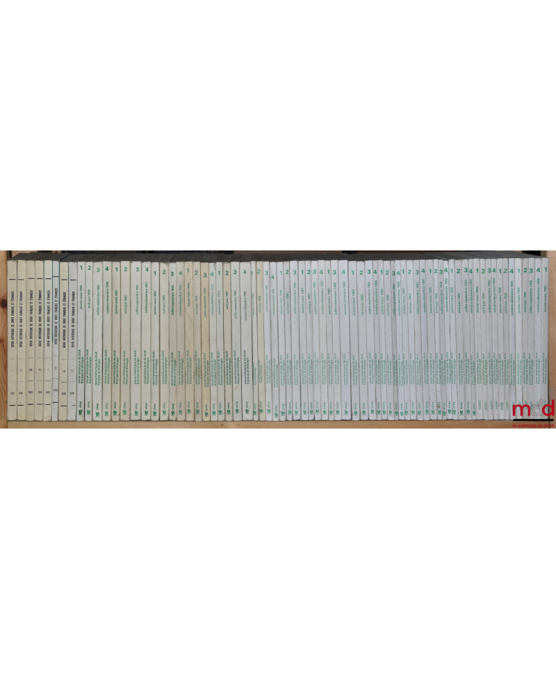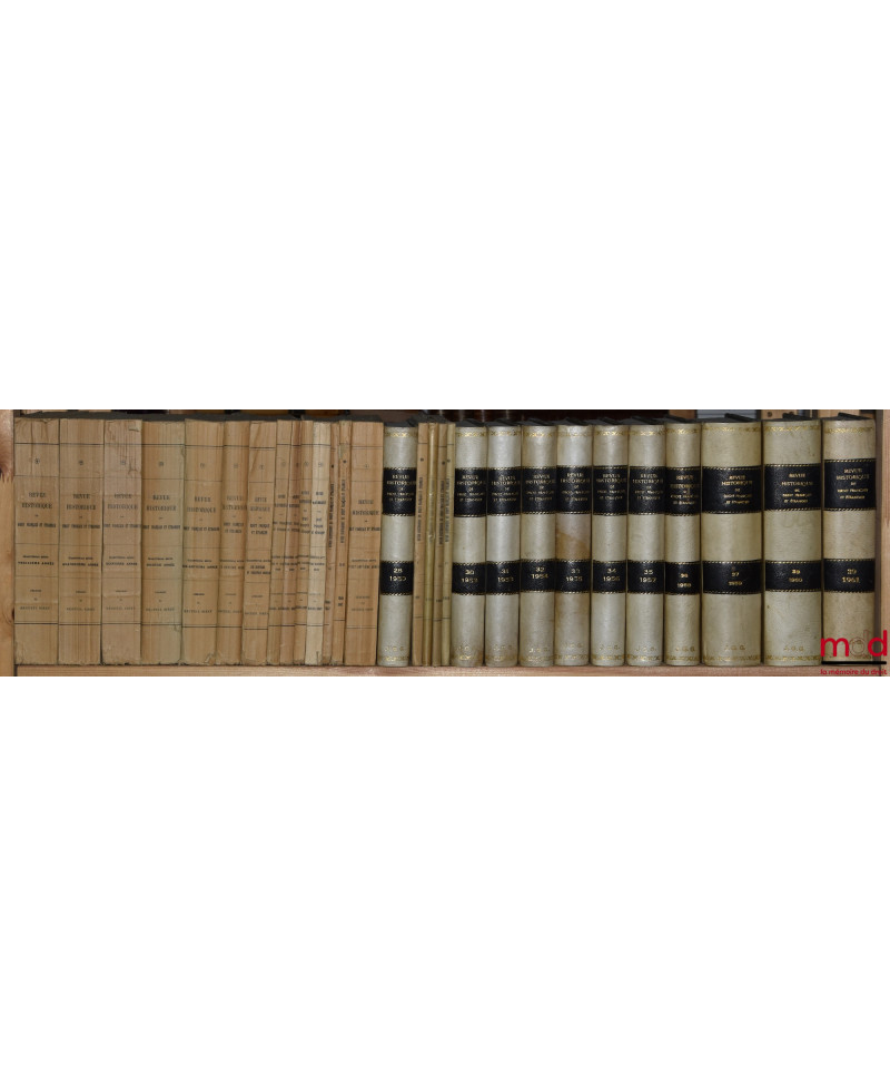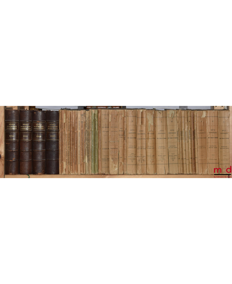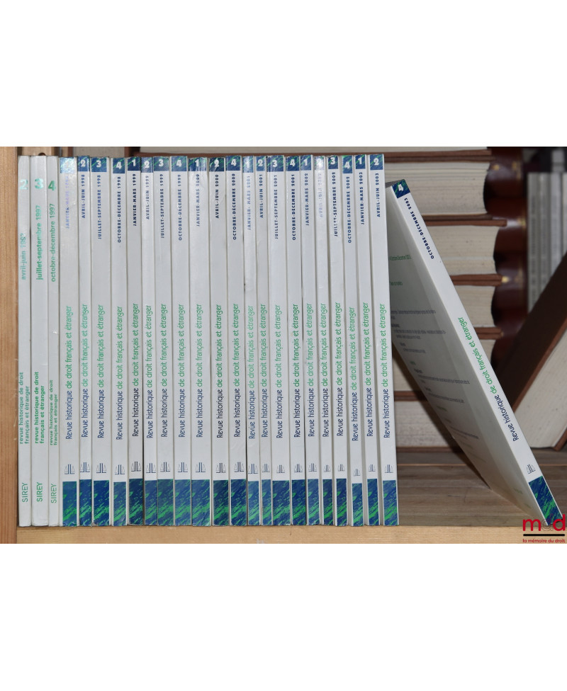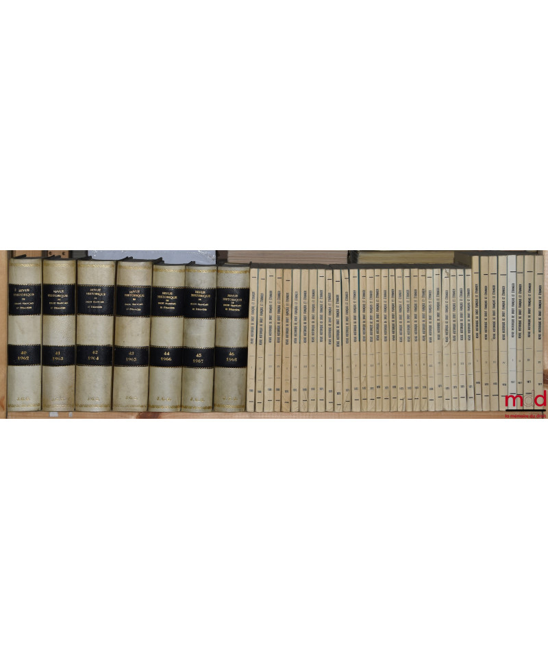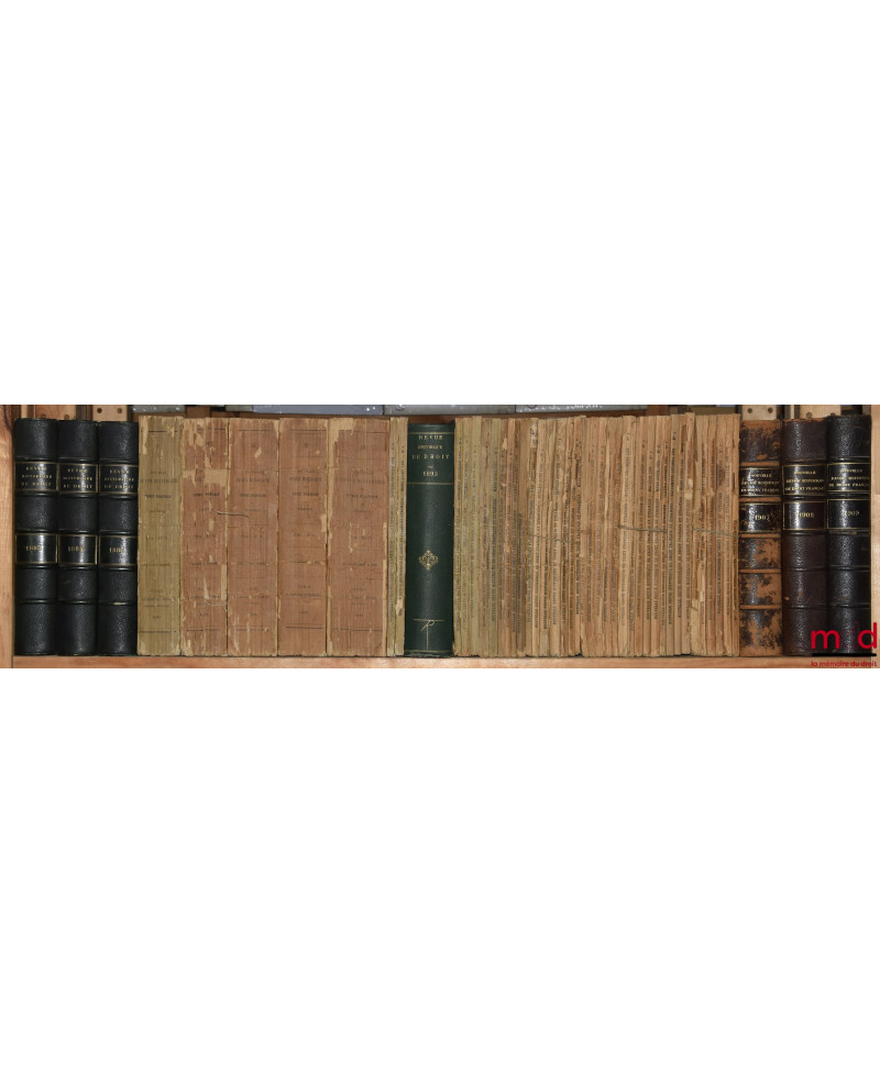 Rarissime collection — malheureusement incomplète — de l’une des plus anciennes publications scientifiques de droit français. Elle quasi introuvable dans les bibliothèques françaises de recherche : elle est particulièrement incomplète à la BNF et à Cujas. Elle recèle pourtant une quantité impressionnante d’articles de premier plan rédigés par É. Laboulaye, R. Dareste, C. Ginouilhac, C. Giraud, A. Esmein, G. Boissonade, P. Gide, J. Flach, J. Tardif, G. Appert, F. Senn, P. F. Girard, E. Perrot, O. Martin, G. May, G. Lepointe, J. Gaudemet, J. Ellul, H. Levy-Brühl, P. Noailles, G. Le Bras, P. Timbal, P. Ourliac, J. Imbert, etc. sans énumérer les nombreux et brillants auteurs étrangers. Rare.