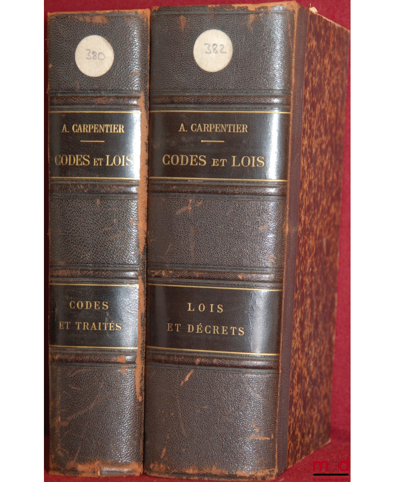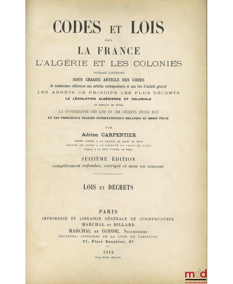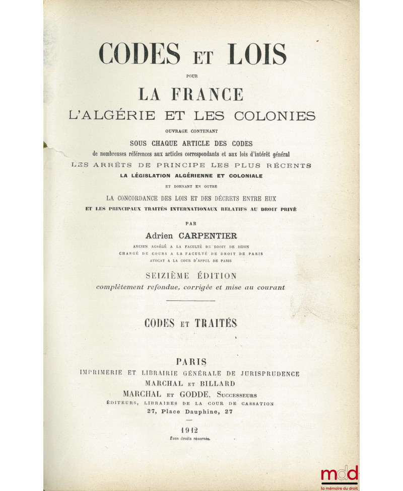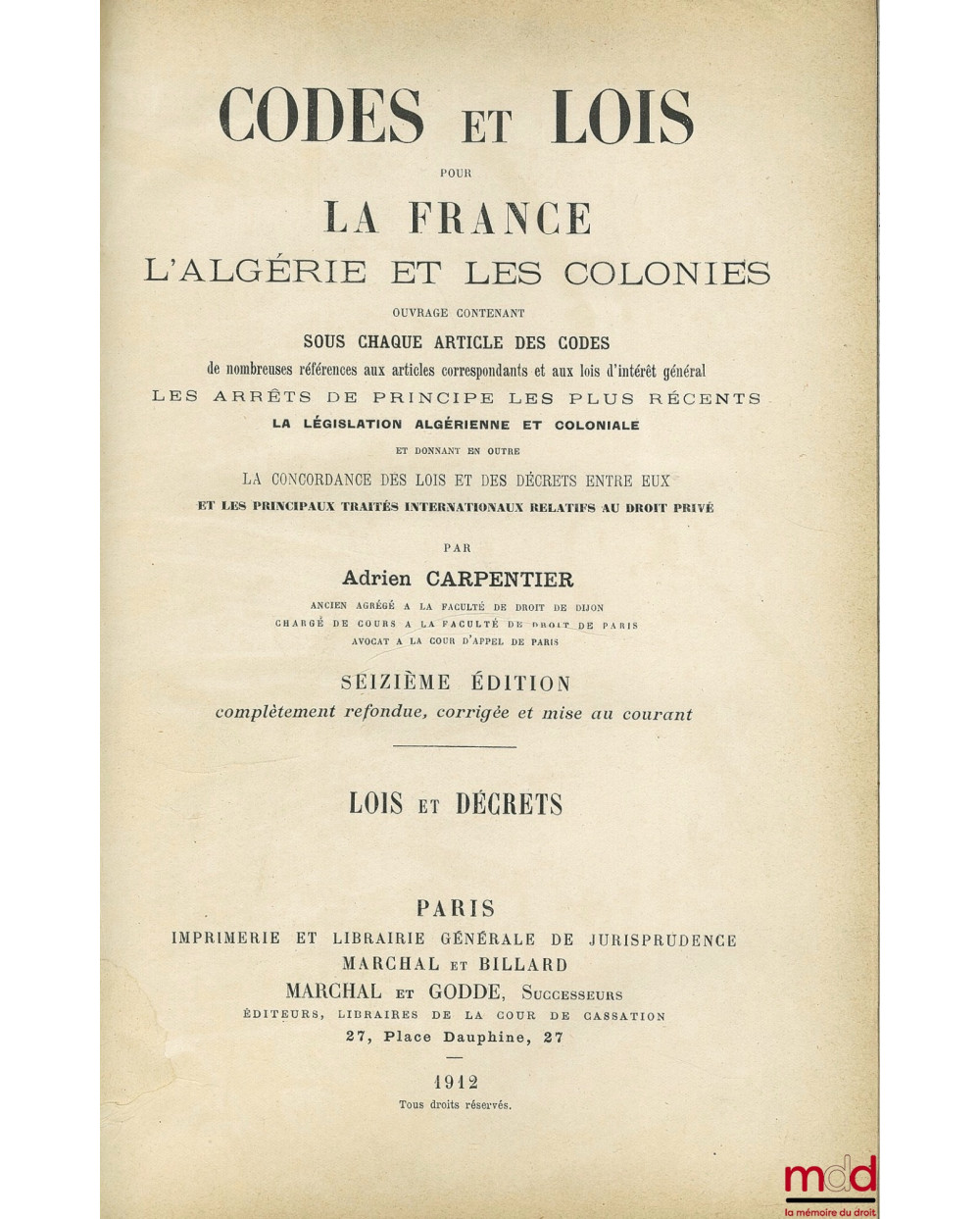 CODES ET LOIS POUR LA FRANCE, L’ALGÉRIE ET LES COLONIES. CODES ET TRAITÉS. LOIS ET DÉCRETS, Ouvrage contenant sous chaque article des codes de nombreuses références aux articles correspondants et aux lois d’intérêt général LES ARRÊTS DE PRINCIPES LES PLUS RÉCENTS, La législation algérienne et coloniale en donnant en outre la concordance des lois et des décrets entre eux et les principaux traités internationaux relatifs au droit privé, 16ème éd. refondue, corrigée et mise au courant ; LOIS ET DÉCRETS ; CODES ET TRAITÉS : CODE CIVIL ; CODE DE PROCÉDURE CIVILE ; CODE DE COMMERCE ; CODE D’INSTRUCTION CRIMINELLE ; CODE PÉNAL ; CODE FORESTIER ; TRAITÉS, CONVENTIONS, DÉCLARATIONS DE DROIT INTERNATIONAL ; APPENDICES Traités d’union et conventions multiples