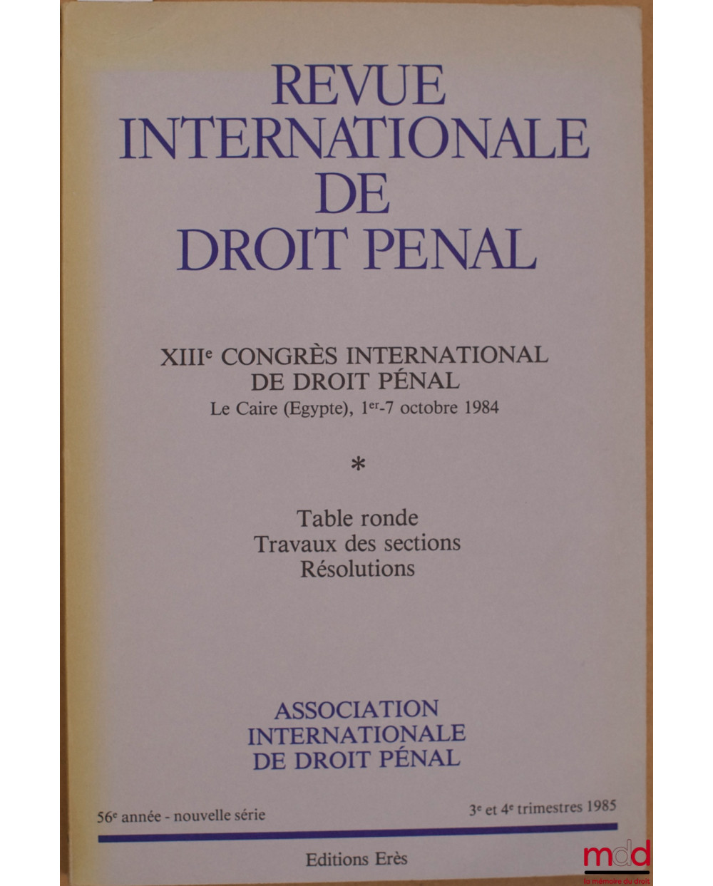 REVUE INTERNATIONALE DE DROIT PÉNAL, 56e année, nouvelle série, 3e-4e trim. 1985, XIIIe CONGRÈS INTERNATIONAL DE DROIT PÉNAL, Le Caire (Égypte, 1er - 7 oct. 1984, Table ronde - Travaux des sections - Résolutions