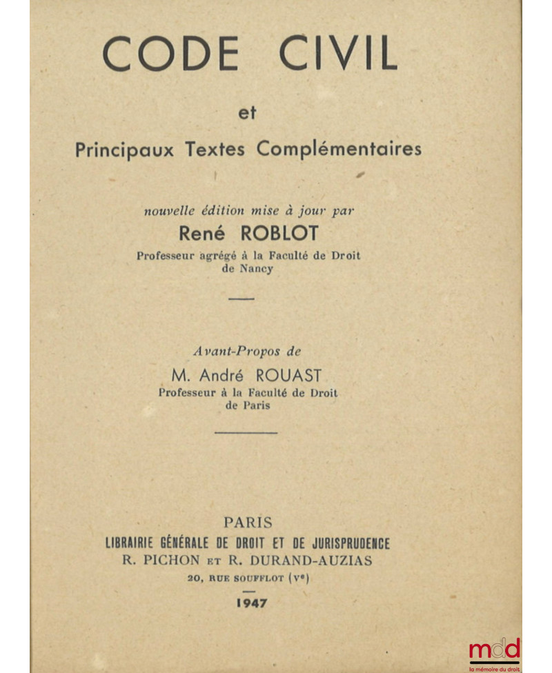 CODE CIVIL et principaux textes complémentaires, Avant-propos de M. André Rouast, Nouvelle éd. mise à jour par René Roblot