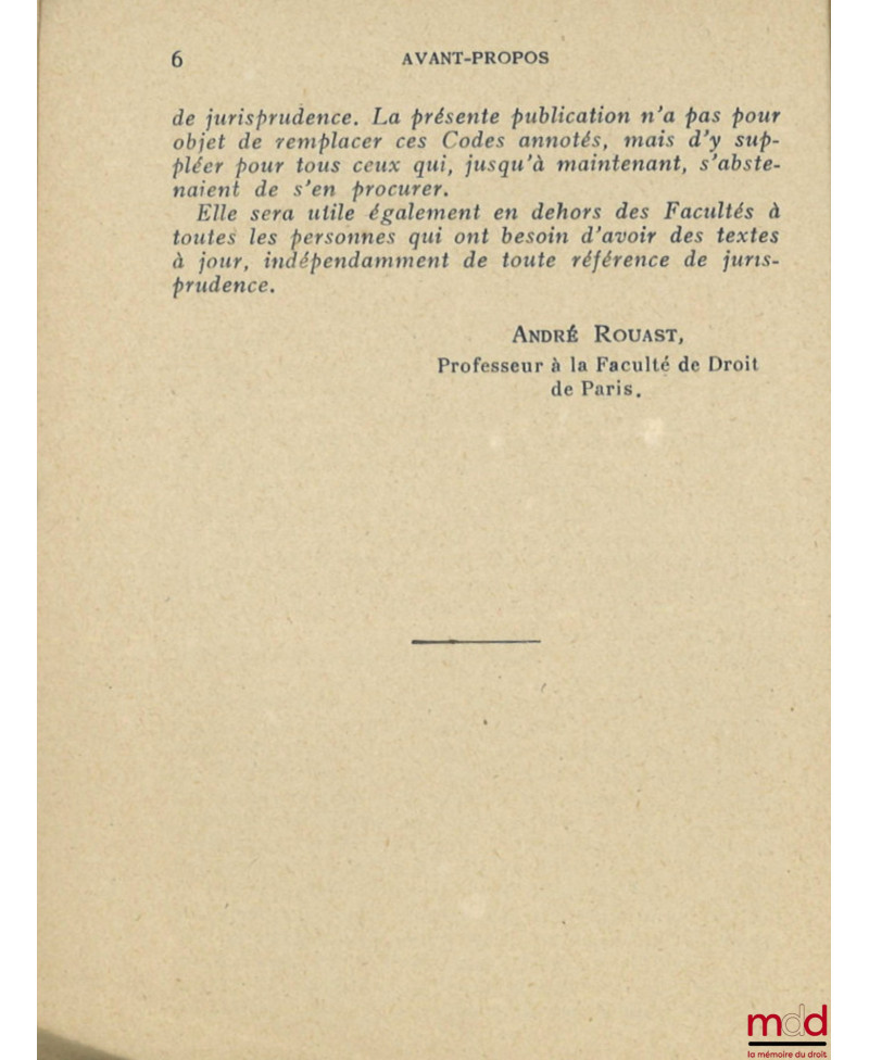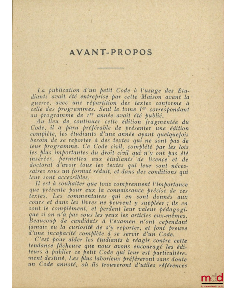 « La publication d’un petit Code à l’usage des Étudiants avait été entreprise par cette Maison avant la guerre, avec une répartition des textes conforme à celle des programmes. Seul le tome Ier correspondant au programme de 1re année avait été publié. Au lieu de continuer cette édition fragmentée du Code, il a paru préférable de présenter une édition complète, les étudiants d’une année ayant quelquefois besoin de se reporter à des textes qui ne sont pas de leur programme. Ce Code civil, complété par les lois les plus importantes du droit civil qui n’y ont pas été insérées permettra aux étudiants de licence et de doctorat d’avoir tous les textes qui leur sont nécessaires sous un format réduit. et dans des conditions qui leur sont accessibles.Il est à souhaiter que tous comprennent l’importance que présente pour eux la connaissance précise de ces textes.Les commentaires qui en sont donnés aux cours et dans les livres ne peuvent y suppléer ; ils en sont le complément, et perdent leur valeur pédagogique si on n’a pas sous les yeux les articles eux-mêmes.Beaucoup de candidats à l’examen n’ont cependant jamais eu la curiosité de s’y reporter, et font preuve d’une incapacité complète à se servir d’un Code.C’est pour aider les étudiants à réagir contre cette tendance fâcheuse que nous avons encouragé les éditeurs à publier ce petit Code qui leur est particulièrement destiné. Les plus laborieux préféreront sans doute un Code annoté, où ils trouveront d’utiles références de jurisprudence.La présente publication n’a pas pour objet de remplacer ces Codes annotés, mais d’y suppléer pour tous ceux qui, jusqu’à maintenant, s’abstenaient de s’en procurer.Elle sera utile également en dehors des Facultés à toutes les personnes qui ont besoin d’avoir des textes à jour, indépendamment de toute référence de jurisprudence. » (Avant-propos de André Rouast).