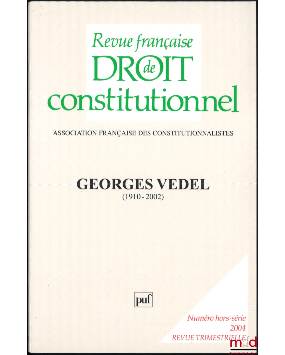 GEORGES VEDEL (1910-2002), Numéro hors-série mai 2004, REVUE FRANÇAISE DE DROIT CONSTITUTIONNEL, Numéro réalisé avec le concours du ministère de la Jeunesse de l’Education nationale et de la Recherche de la ville de Paris, des univ. Paris I (Panthéon-Sorbonne) et Paris II (Panthéon-Assas) et de l’Association française des constitutionnalistes ; Revue trimestrielle publiée avec le concours du Centre national du Livre