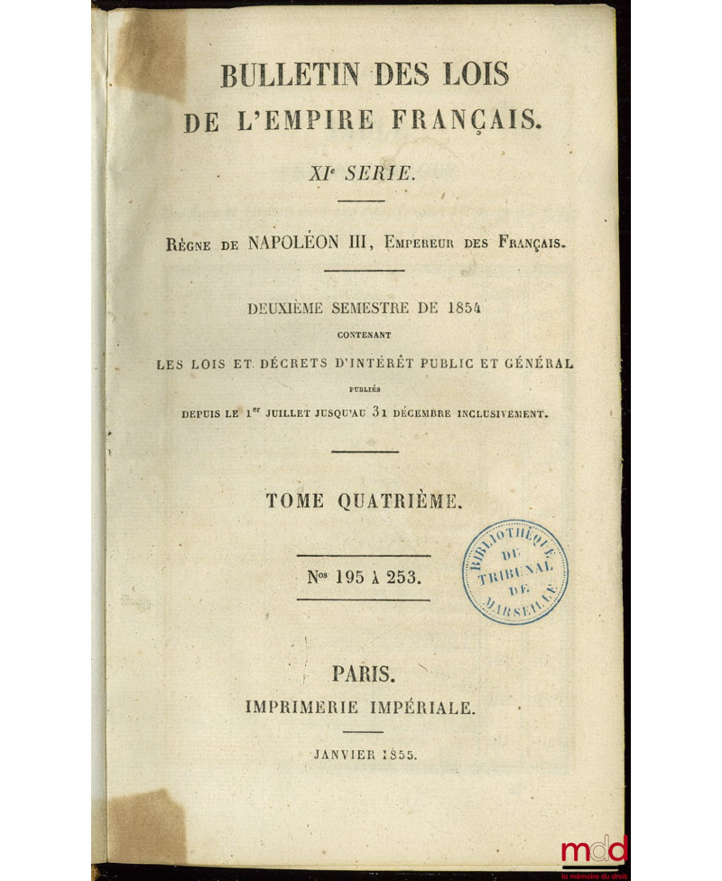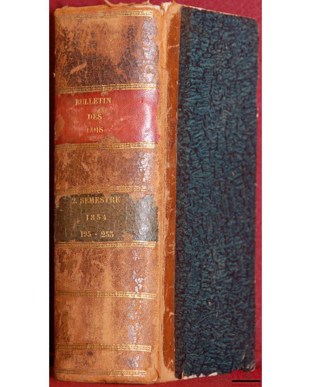 BULLETIN DES LOIS DE L'EMPIRE FRANÇAIS, XIÈME SÉRIE, RÈGNE DE NAPOLÉON III, Empereur des Français. Deuxième semestre de 1854 contenant les Lois et Décrets d'intérêt public et général publiés depuis le 1er juillet jusqu'au 31 décembre inclusivement, TOME QUATRIÈME, n° 195 à 253