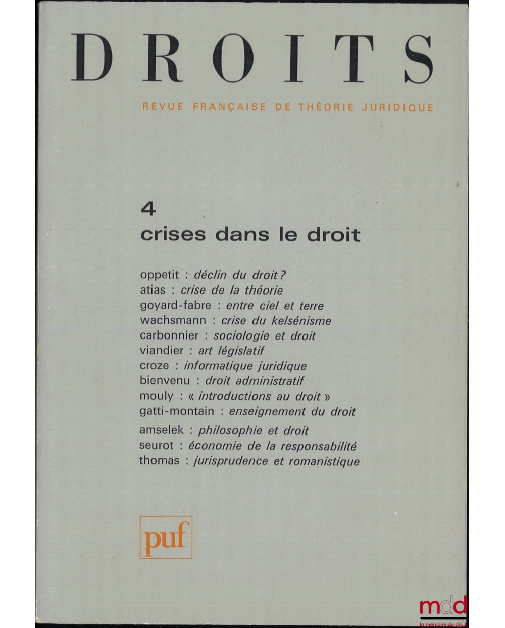 Livraison épuisée de la revue Droits qui contient notamment les articles de S. Rials, Ouverture : Quelles crises ? Quel droit ? B. Oppetit, L’hypothèse du déclin du droit ; Ch. Atias, Une crise de légitimité seconde ; S. Goyard-Fabre, Le droit est-il de ce monde ? P. Wachsmann, Le kelsénisme est-il en crise ? Entretien avec jean Carbonnier : Sociologie juridique et crise du droit ; A. Viandier, La crise de la technique législative ; H. Croze, Le droit malade de son information ; J.-J. Bienvenu, Le droit adminsitratif ; une crise sans catastrophe ; Ch. Mouly, Crise des introductions au droit ; J. Gatti-Montain, Le droit et son enseignement ; un demi-siècle de réflexions ; P. Amselek, L’interpellation actuelle de la réflexion philosophique par le droit ; Fr. Seurot, La théorie économique de la responsabilité et le positivisme juridique ; Y. Thomas, La romanistique et la notion de jurisprudence.