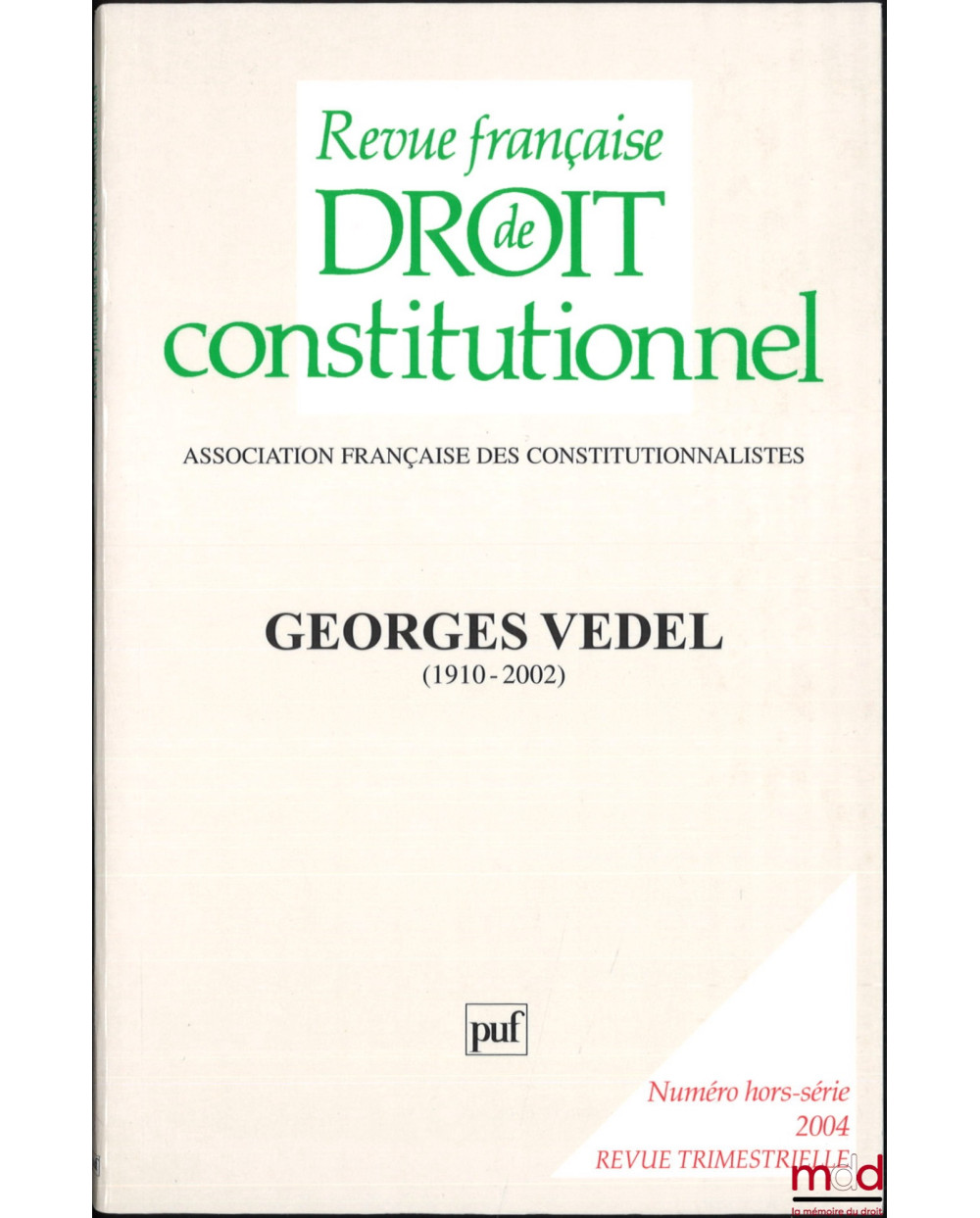 GEORGES VEDEL (1910-2002), Numéro hors-série mai 2004, REVUE FRANÇAISE DE DROIT CONSTITUTIONNEL, Numéro réalisé avec le concours du ministère de la Jeunesse de l’Education nationale et de la Recherche de la ville de Paris, des univ. Paris I (Panthéon-Sorbonne) et Paris II (Panthéon-Assas) et de l’Association française des constitutionnalistes