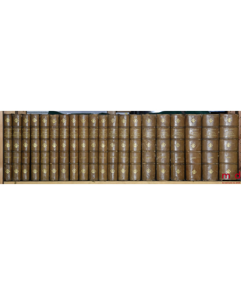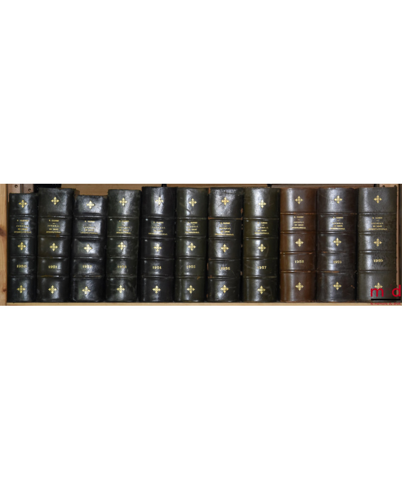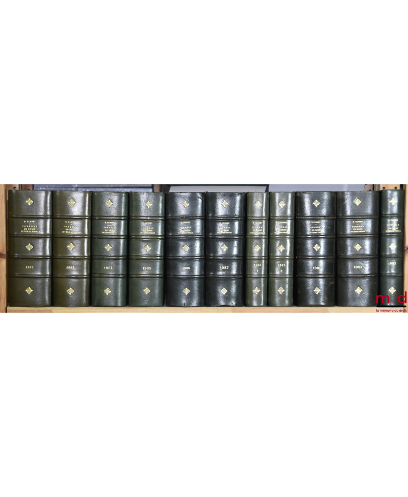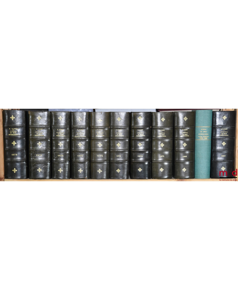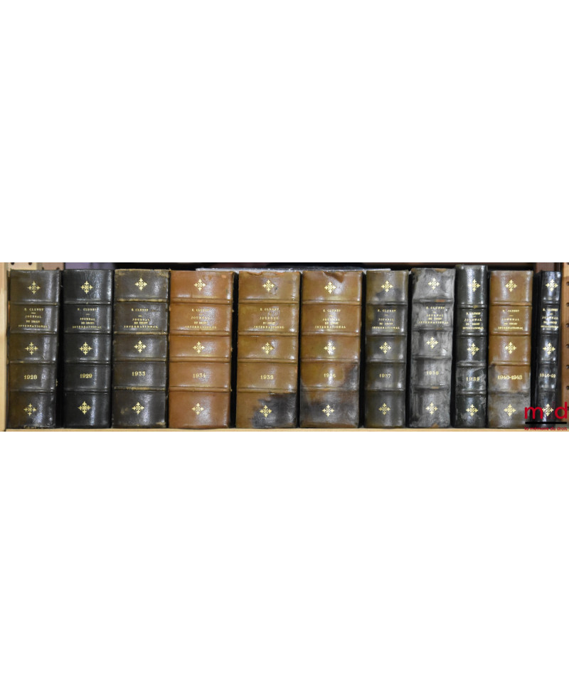 JOURNAL DE DROIT INTERNATIONAL PRIVÉ, Recueil critique de doctrine, jurisprudence et législation, concernant les étrangers et les conflits de lois dans les différents pays, publié avec le concours de MM. Ch. Demangeat et P. S. Mancini, par Édouard CLUNET, de 1874 [tête de collection] à 1949 [mq. 5 années] ; Tables de 1874 à 1905 (4 vol.), 1905-1925 (1 vol.)