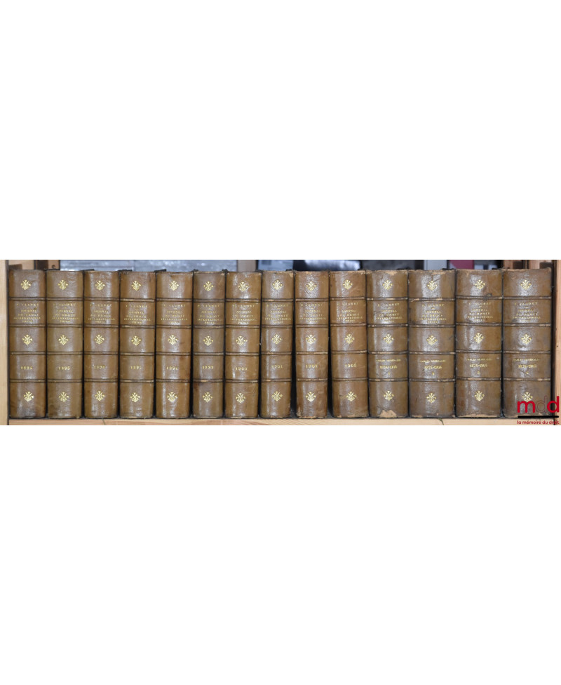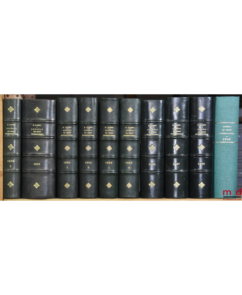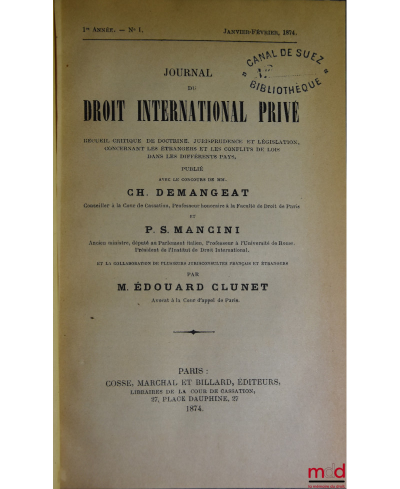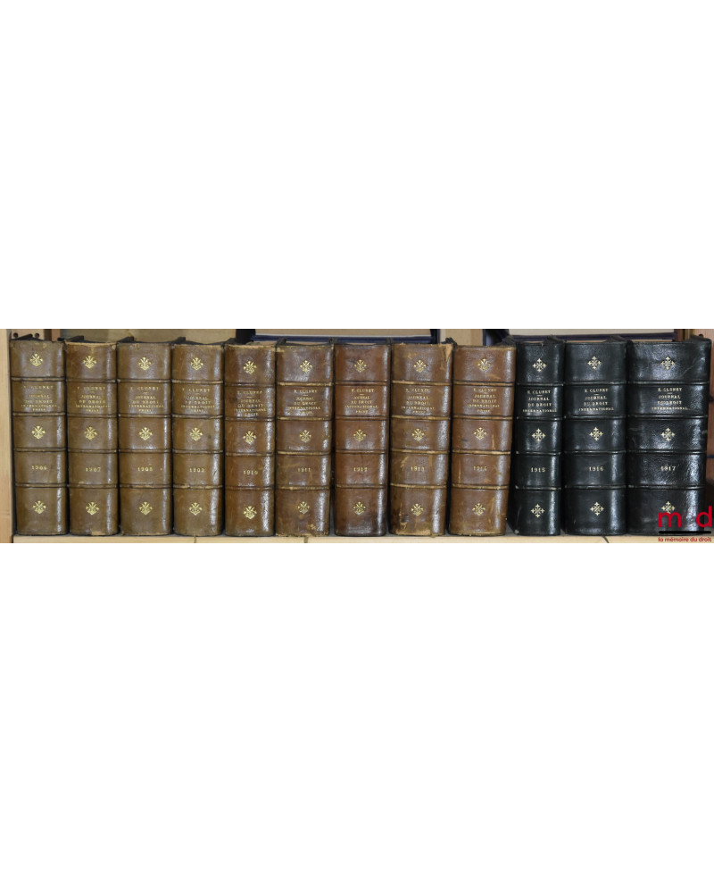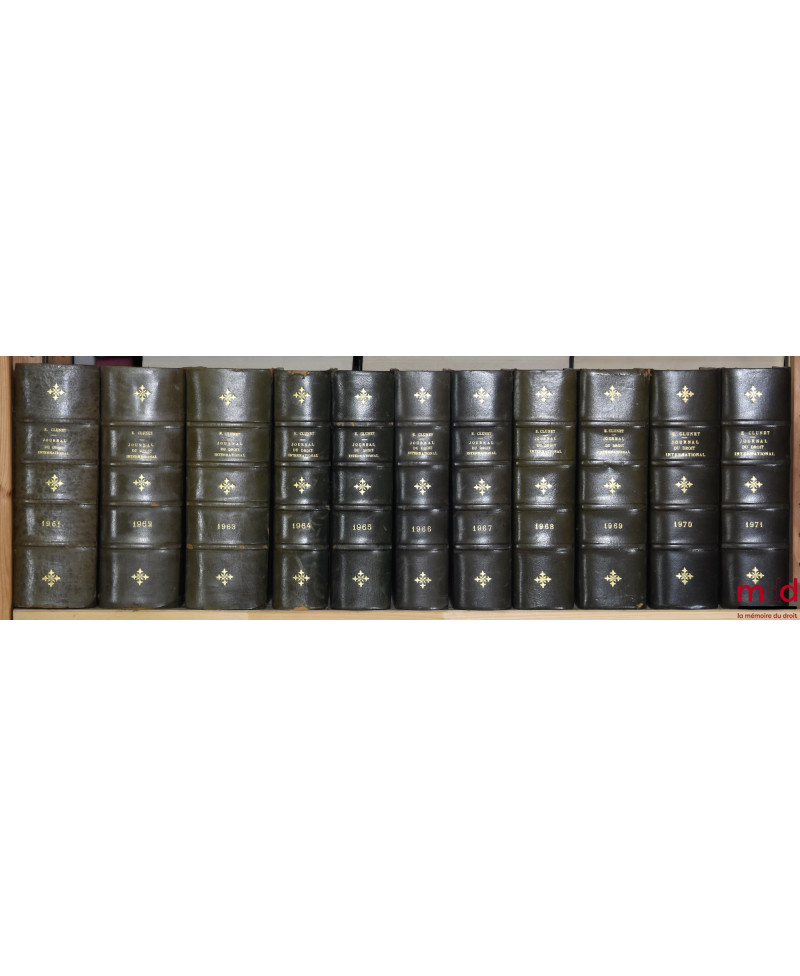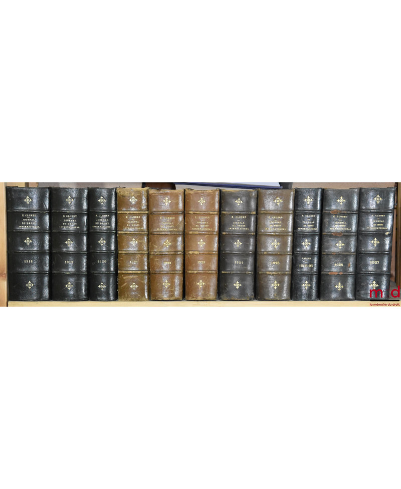 JOURNAL DE DROIT INTERNATIONAL PRIVÉ, Recueil critique de doctrine, jurisprudence et législation, concernant les étrangers et les conflits de lois dans les différents pays, publié avec le concours de MM. Ch. Demangeat et P. S. Mancini, par Édouard CLUNET, de 1874 [tête de collection] à 1949 [mq. 5 années] ; Tables de 1874 à 1905 (4 vol.), 1905-1925 (1 vol.)