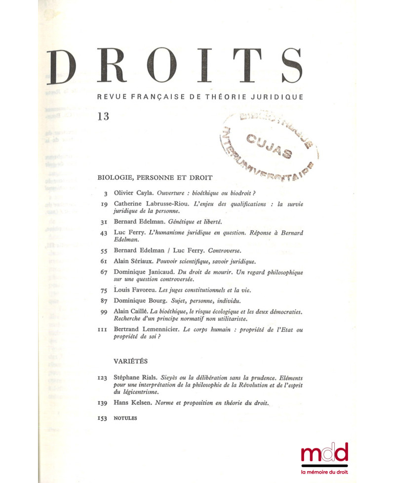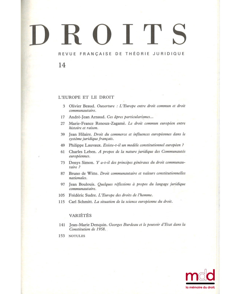 Deux numéros épuisés de la revue Droits qui contient notamment les articles de Catherine Labrusse-Riou, l’enjeu des qualifications : la survie juridique de la personne ; Bernard Edelman, génétique et liberté ; Luc Ferry, l’humanisme juridique en question, réponse à Bernard Edelman ; Alain Sériaux, pouvoir scientifique, savoir juridique ; Louis Favoreu, les juges constitutionnels et la vie ; Stéphane Rials, Sieyès ou la délibération sans la prudence, éléments pour une interprétation de la philosophie de la Révolution et de l’esprit du légicentrisme ; Hans Kelsen, norme et propositions en théorie du droit ; Olivier Beaud, l’Europe entre droit commun et droit communautaire ; André-Jean Arnaud, Ces âpres particularismes ; Jean Hilaire, Droit du commerce et influences européennes dans le système juridique français ; Denys Simon, Y a-t-il des principes généraux du droit communautaire ? ; Jean Boulouis, Quelques réflexions à propos du langage juridique communautaire ; Frédéric Sudre, L’Europe des droits de l’Homme ; Carl Schmitt, La situation de la science européenne du droit.