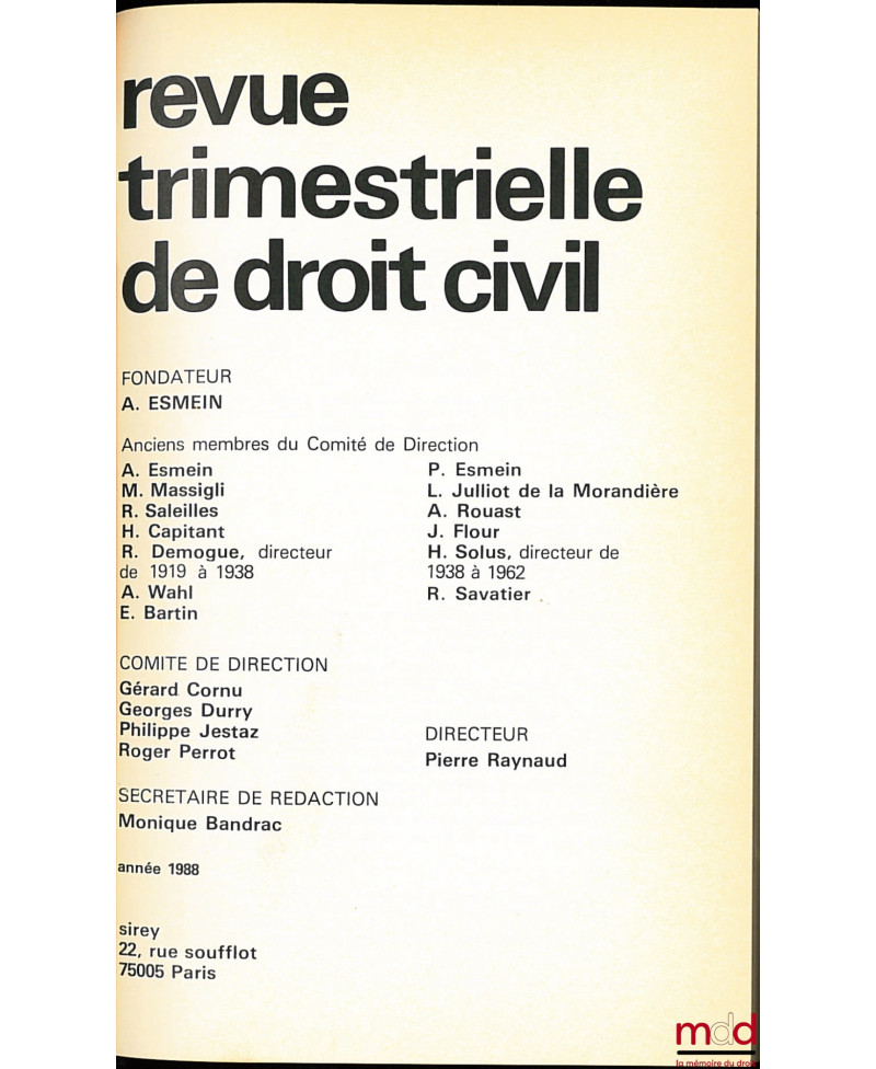 REVUE TRIMESTRIELLE DE DROIT CIVIL fondée par A. Esmein, l’année 1988