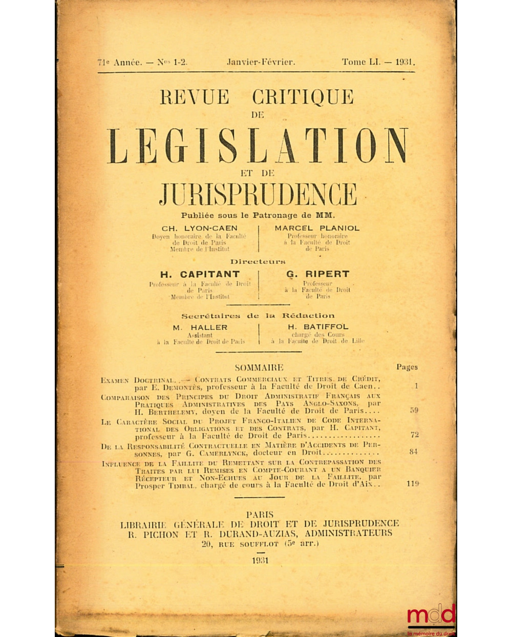 REVUE CRITIQUE DE LÉGISLATION ET DE JURISPRUDENCE n° 1-2, t. LI, 1931