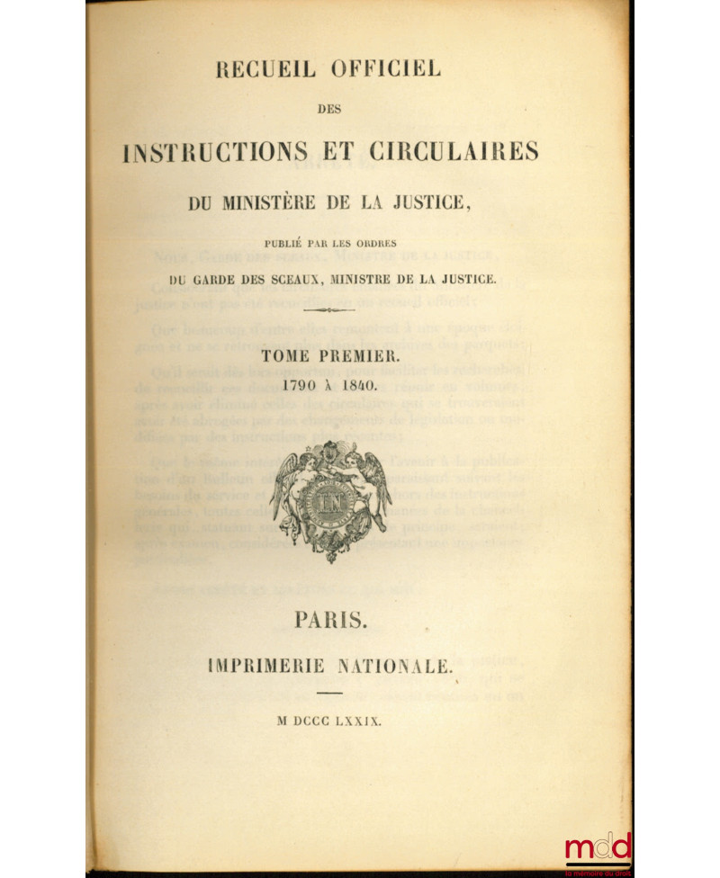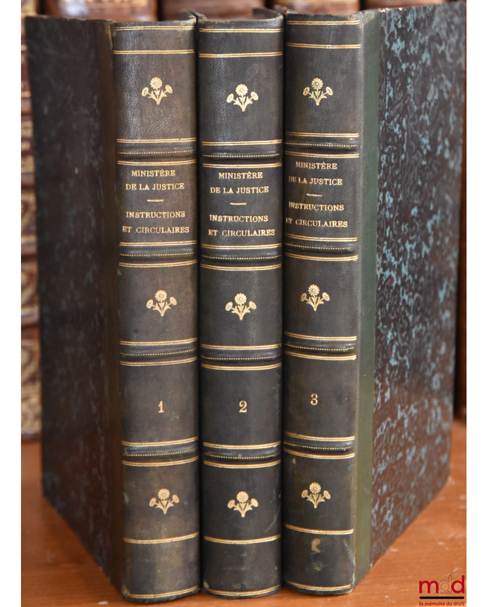 RECUEIL OFFICIEL DES INSTRUCTIONS ET CIRCULAIRES DU MINISTÈRE DE LA JUSTICE, publié par les ordres du Garde des Sceaux, Ministre de la Justice, t. I : 1790 à 1840, t. II : 1841 à 1862 & t. III : 1863 à 1875