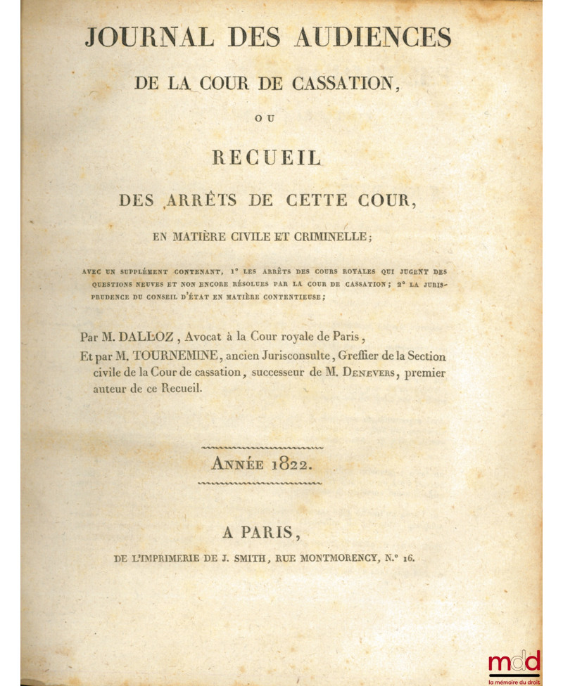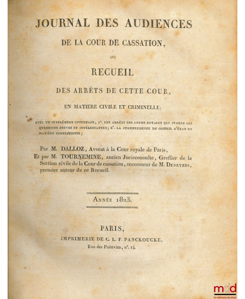 JOURNAL DES AUDIENCES DE LA COUR DE CASSATION ou RECUEIL DES ARRÊTS DE CETTE COUR, en matière civile et criminelle ; avec un supplément contenant, 1° Les arrets des cours royales qui jugent des question neuves et non encore résolues par la cour de cassation ; 2° La jurisprudence du Conseil d’État en matière contentieuse, Année 1822 & 1823